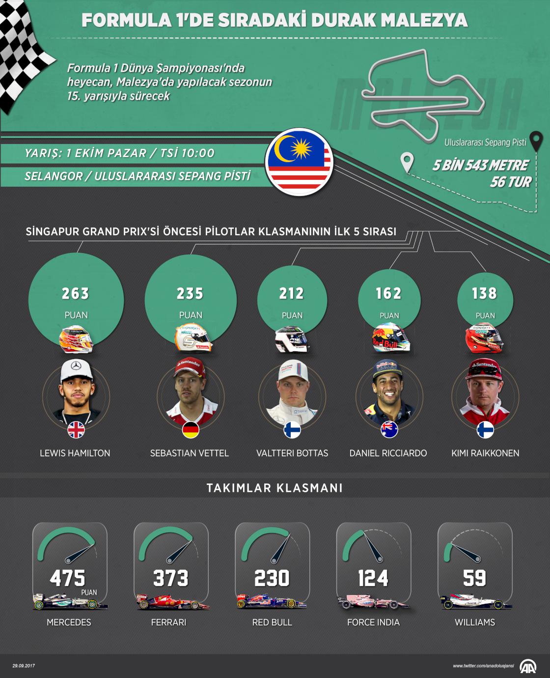 Formula 1 Dünya Şampiyonası'nda heyecan, Malezya'da yapılacak sezonun 15. yarışıyla sürecek. Malezya'nın Selangor eyaletindeki 5 bin 543 metrelik Uluslararası Sepang Pisti'nde 56 tur üzerinden koşulacak yarışın sıralama turu yarın TSİ 12.00'de, yarış ise 1 Ekim Pazar günü TSİ 10.00'da gerçekleştirilecek. Sezonun şu ana kadar koşulan 14 yarışında Avustralya, Bahreyn, Monaco ve Macaristan'da Ferrari pilotu Sebastian Vettel, Çin, Kanada, İspanya, Büyük Britanya, Belçika, İtalya ve Singapur'da Mercedes pilotu Lewis Hamilton, Rusya ve Avusturya'da Valtteri Bottas, Azerbaycan'da ise Daniel Ricciardo kürsünün zirvesine çıktı. ( Kemal Delikmen - Anadolu Ajansı )29 Eylül 2017•Güncelleme: 29 Eylül 2017