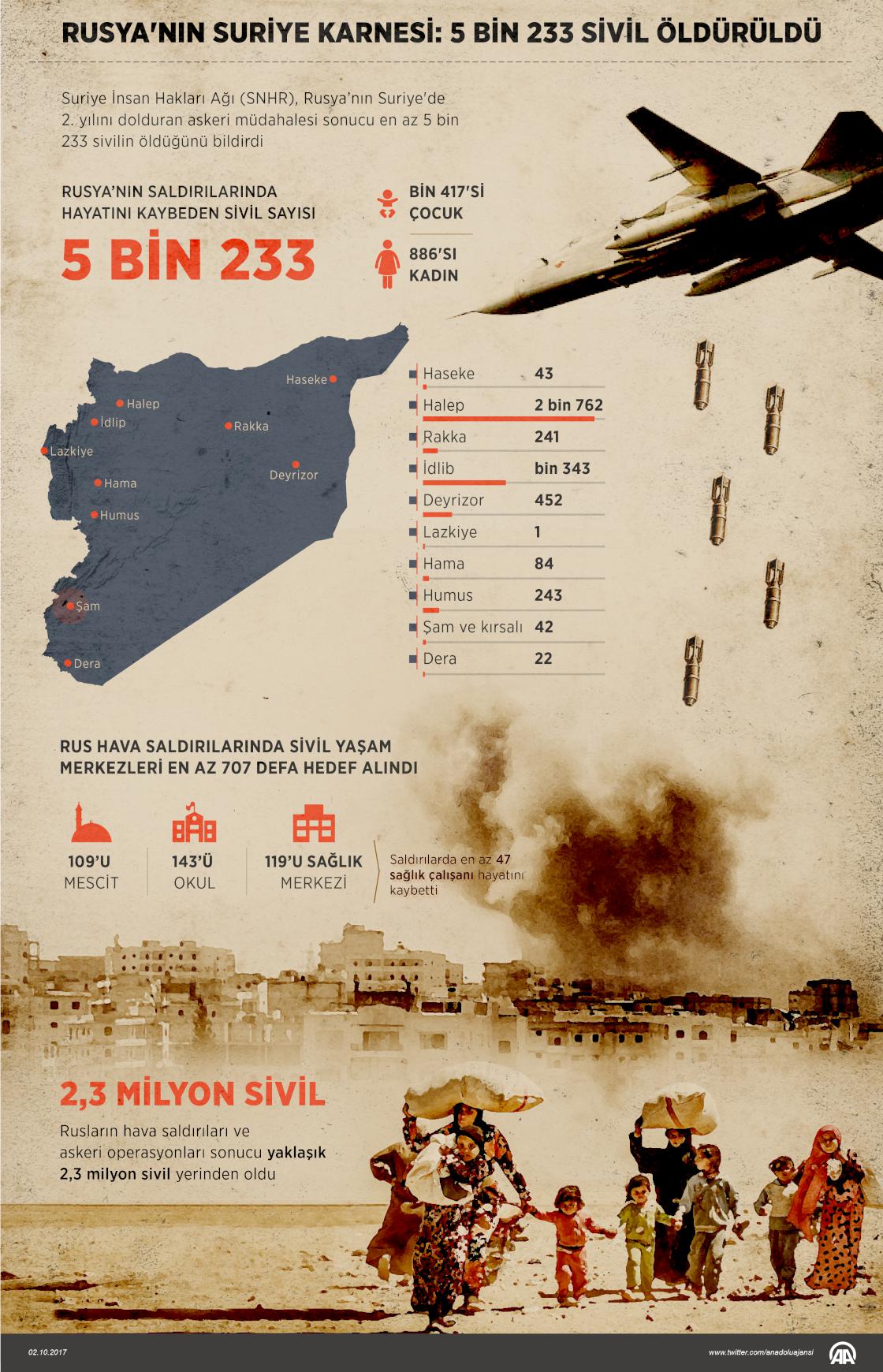 Suriye İnsan Hakları Ağı (SNHR), Rusya’nın Suriye'de 2. yılını dolduran askeri müdahalesi sonucu en az 5 bin 233 sivilin öldüğünü bildirdi. Raporda, "Rusya'nın Suriye'deki 2. yılını dolduran askeri müdahalesinde bin 417'si çocuk, 886'sı kadın en az 5 bin 233 sivil yaşamını yitirdi." ifadesine yer verildi. Suriye’de Rus hava saldırıları sonucu 109 mescit, 143 okul ve 119 sağlık merkezinin yer aldığı sivil yaşam merkezleri en az 707 defa hedef alındı. Bu saldırılar sonucu en az 47 sağlık çalışanı hayatını kaybetti. ( Yasin Demirci - Anadolu Ajansı )02 Ekim 2017•Güncelleme: 02 Ekim 2017