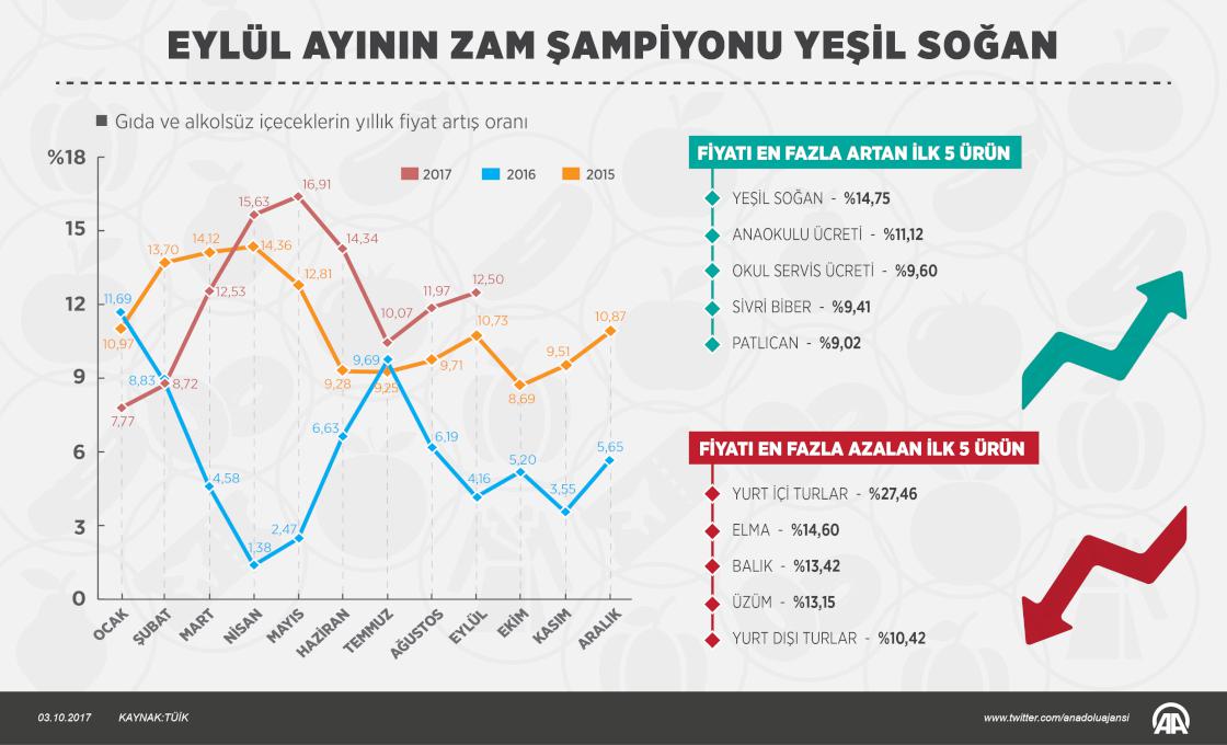Türkiye İstatistik Kurumu (TÜİK) verilerine göre, yeşil soğandaki fiyat artışını yüzde 11,12 ile anaokulu ücreti izledi. Eylülde fiyatı en çok artış gösteren diğer ürünler ise yüzde 9,60 ile okul için servis ücreti, yüzde 9,41 ile sivri biber, yüzde 9,02 ile patlıcan, yüzde 8,62 ile çocuk spor kazağı (sweatshirt), yüzde 8,18 ile yurt ücretleri, yüzde 7,58 ile antep fıstığı, yüzde 7,48 ile domates ve yüzde 6,95 ile limon oldu.
