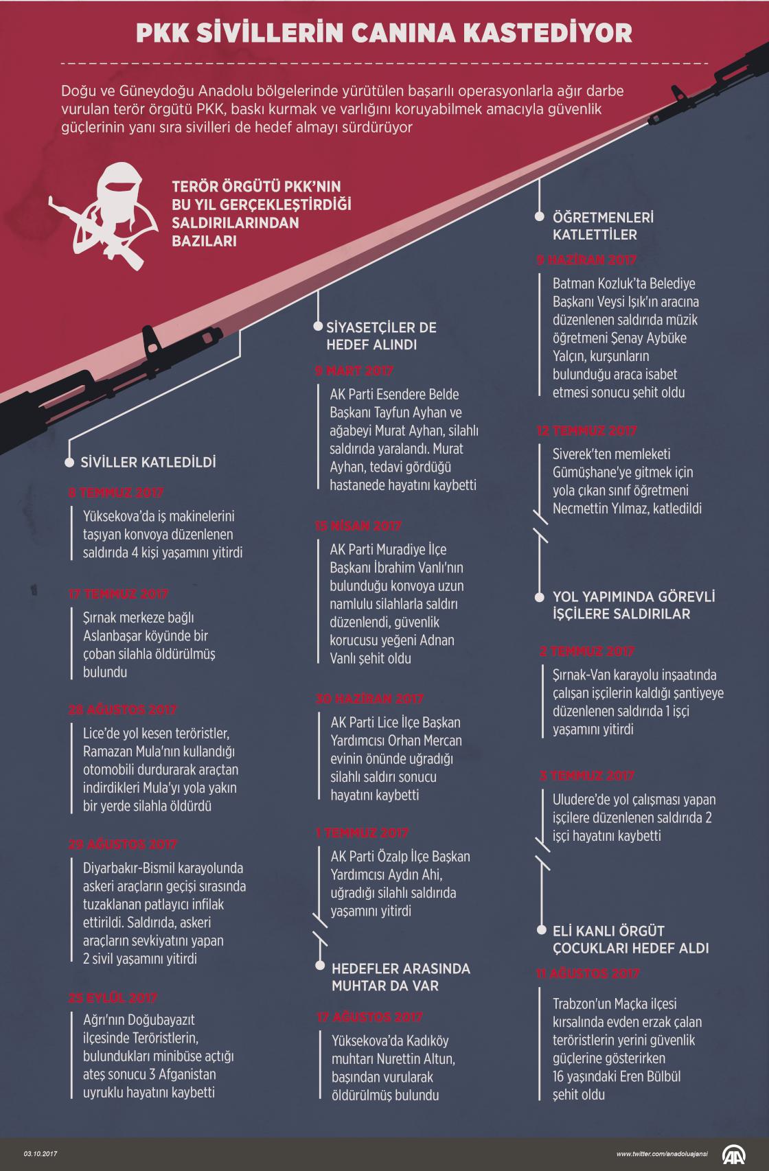 Doğu ve Güneydoğu Anadolu bölgelerinde yürütülen başarılı operasyonlarla ağır darbe vurulan terör örgütü PKK, baskı kurmak ve varlığını koruyabilmek amacıyla sivilleri de hedef almayı sürdürüyor. Arkasında halk desteği bulamayan eli kanlı terör örgütü, saldırılarına çocuk, genç, yaşlı, öğretmen, muhtar, siyasetçi ayrımı yapmaksızın devam ediyor. ( Ahmet Burak Özkan - Anadolu Ajansı )03 Ekim 2017•Güncelleme: 03 Ekim 2017