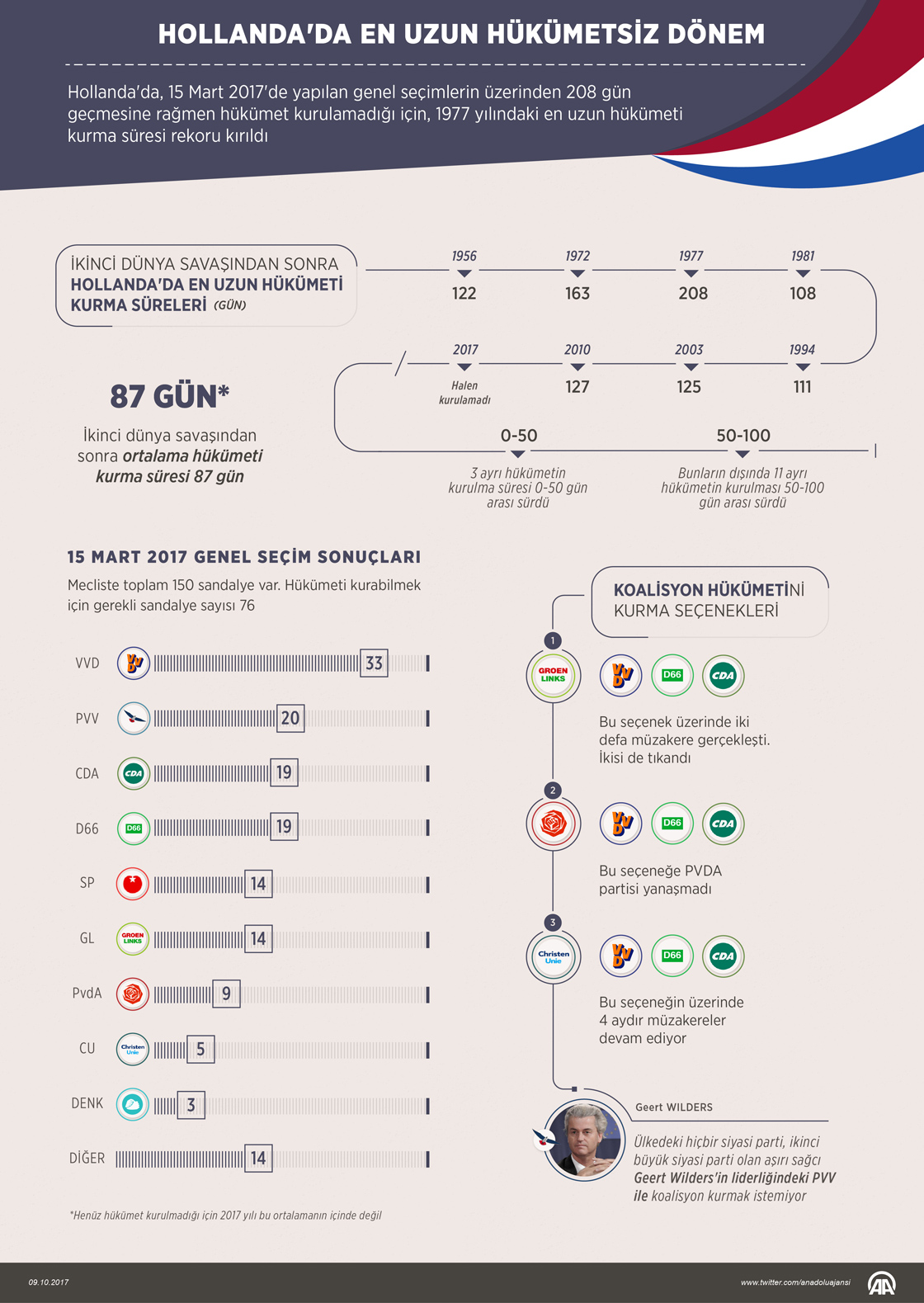 Hollanda'da 15 Mart 2017'deki genel seçimin üzerinden 208 gün geçmesine rağmen ülkede hala hükümet kurulamadı.Çoğunlukla koalisyon hükümetlerinin yönettiği Hollanda'da, İkinci Dünya Savaşı'ndan sonra hükümeti kurma çalışmaları en uzun 1977'de 208, 1972'de 163, 2010'da 127, 2003'te 125 ve 1956'da 122 gün sürdü. Hükümeti kurma çalışmalarının ortalaması 87 gün olan ülkede ayrıca İkinci Dünya Savaşı'ndan beri hiçbir parti tek başına iktidar olamadı. ( Ahmet Burak Özkan - Anadolu Ajansı )09 Ekim 2017•Güncelleme: 09 Ekim 2017