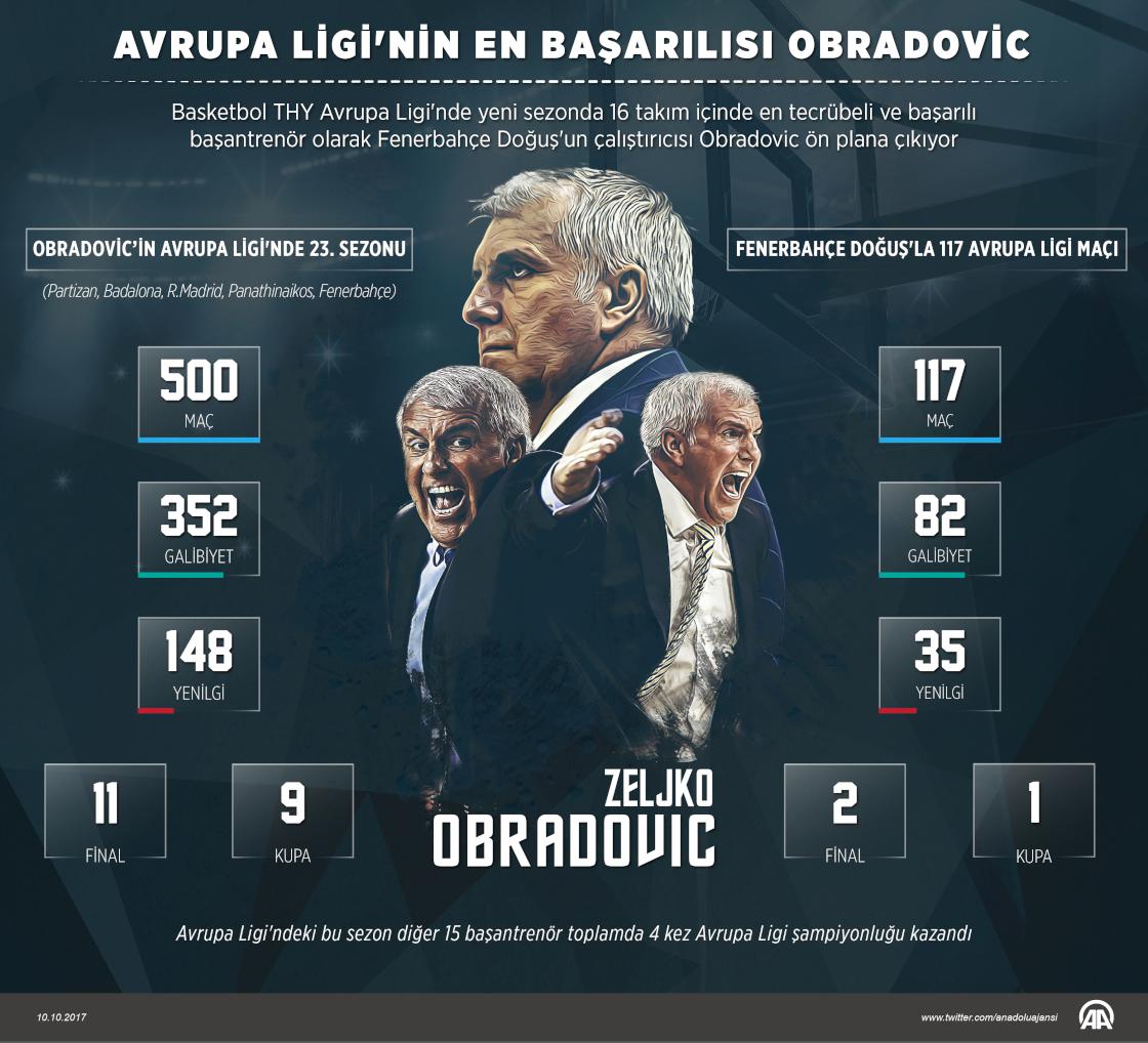 Basketbolda THY Avrupa Ligi'nde yer alacak 16 takım içinde en tecrübeli ve başarılı başantrenör olarak Fenerbahçe Doğuş'un çalıştırıcısı Zeljko Obradovic ön plana çıkıyor. Avrupa Ligi tarafından "efsane" olarak nitelendirilen ve Avrupa basketbolunun en iyi başantrenörü olarak gösterilen Obradovic, THY Avrupa Ligi'nde 23. sezonuna başlayacak. ( Kemal Delikmen - Anadolu Ajansı )10 Ekim 2017•Güncelleme: 10 Ekim 2017