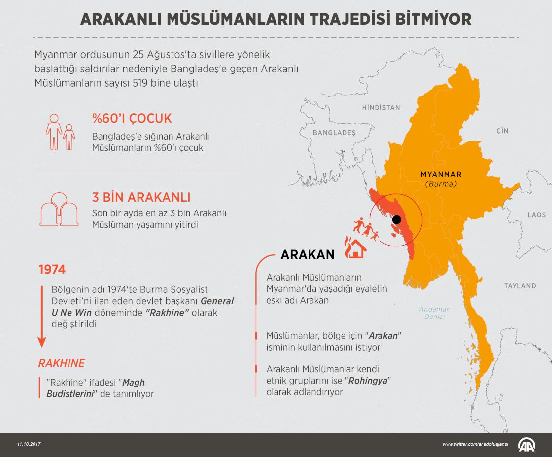 Myanmar ordusunun 25 Ağustos'ta sivillere yönelik başlattığı saldırılar nedeniyle Bangladeş'e geçen Arakanlı Müslümanların sayısı 519 bine ulaştı. Bangladeş'e sığınan Arakanlı Müslümanların yüzde 60'ının çocuk olduğu kaydediliyor. Son bir ayda en az 3 bin Arakanlı Müslüman'ın yaşamını yitirdiği tahmin ediliyor. Yurt dışında yaşayan Arakanlı Müslümanlar, resmi adı "Rakhine" olan eyalet için eski ismi olan "Arakan" kelimesinin kullanılmasını istiyor ( Ahmet Burak Özkan - Anadolu Ajansı )11 Ekim 2017•Güncelleme: 11 Ekim 2017