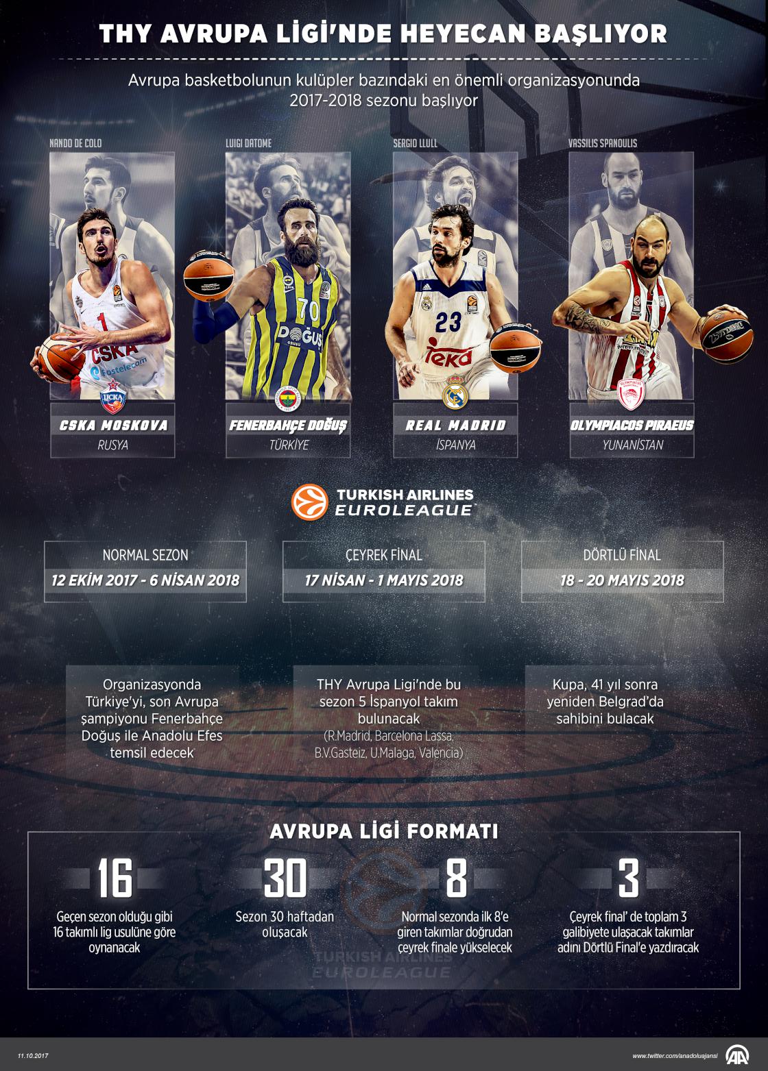 Avrupa basketbolunun kulüpler bazındaki en önemli organizasyonu olan THY Avrupa Ligi'nde yeni sezon yarın oynanacak maçlarla başlayacak. FIBA Avrupa Şampiyon Kulüpler Kupası adı altında 1958 yılında ilk kez düzenlenen en büyük kupa, 1991'de FIBA Avrupa Ligi adı altında oynandı. ( Kemal Delikmen - Anadolu Ajansı )11 Ekim 2017•Güncelleme: 11 Ekim 2017