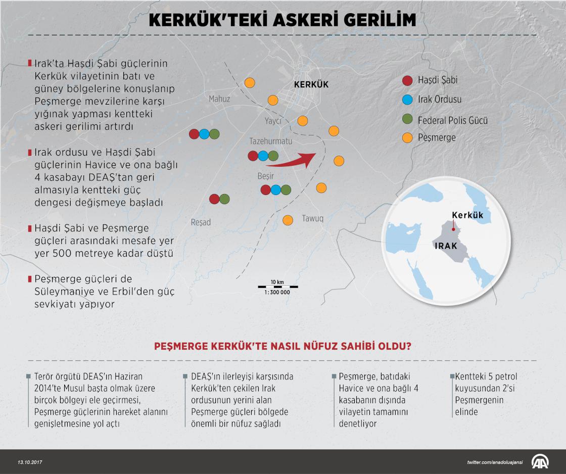 Irak'ta Haşdi Şabi güçlerinin Kerkük vilayetinin batı ve güney bölgelerine konuşlanıp Peşmerge mevzilerine karşı yığınak yapması kentteki askeri gerilimi artırdı. Irak ordusu ve Haşdi Şabi güçlerinin Havice ve ona bağlı 4 kasabayı DEAŞ'tan geri almasıyla kentteki güç dengesi değişmeye başladı. Haşdi Şabi ve Peşmerge güçleri arasındaki mesafe yer yer 500 metreye kadar düştü Peşmerge güçleri de Süleymaniye ve Erbil'den güç sevkiyatı yapıyor. ( Murat Usubaliev - Anadolu Ajansı )13 Ekim 2017•Güncelleme: 13 Ekim 2017
