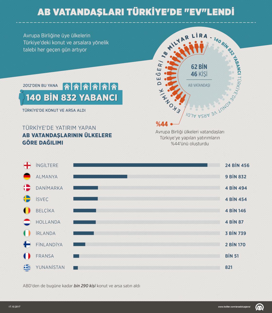 Tapu ve Kadastro Genel Müdürlüğünce, yabancıların Türkiye'den satın aldığı taşınmazlara ilişkin veriler paylaşıldı. Avrupa Birliği vatandaşlarının Türkiye'deki konut ve arsalara yönelik talebi her geçen gün artıyor. Bu kapsamda bugüne kadar yatırımlarını Türkiye'de 18 milyar lira değerinde konut ve arsa alarak değerlendiren 140 bin 832 yabancının yaklaşık yüzde 44'ünü Avrupa Birliği ülkelerinin vatandaşları oluşturdu. ( Ahmet Burak Özkan - Anadolu Ajansı )17 Ekim 2017•Güncelleme: 17 Ekim 2017