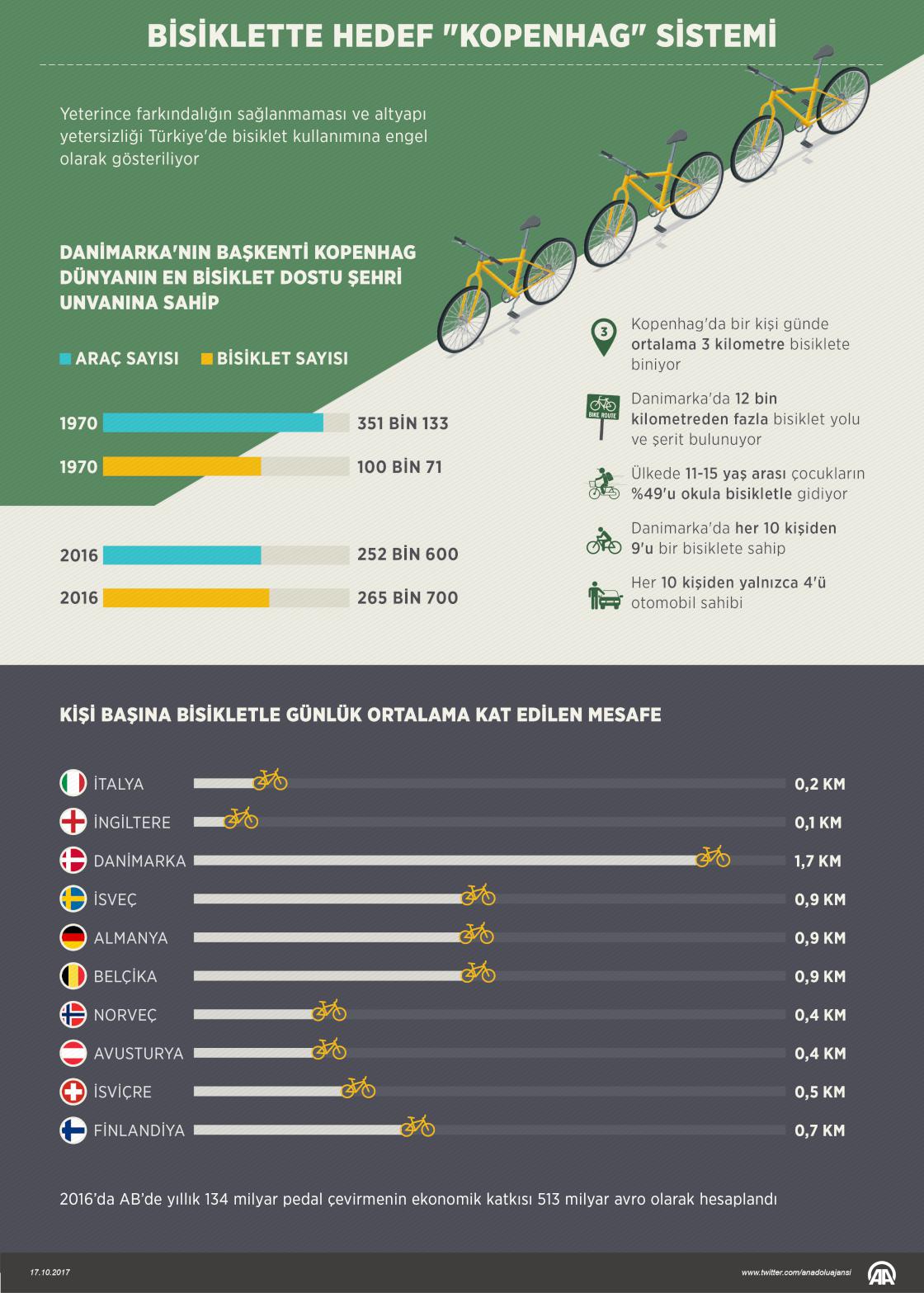 Türkiye'de bisiklet kullanımının yaygınlaştırılması, trafikten kaynaklı hava kirliliğinin azaltılması amacıyla toplu ulaşım altyapısı ve bisiklet yollarına yaptığı yatırımlar sayesinde "Dünyanın en bisiklet dostu şehri" unvanına sahip Danimarka'nın başkenti Kopenhag'ın sistemini hedef olarak belirlendi. ( Yasin Demirci - Anadolu Ajansı )17 Ekim 2017•Güncelleme: 17 Ekim 2017