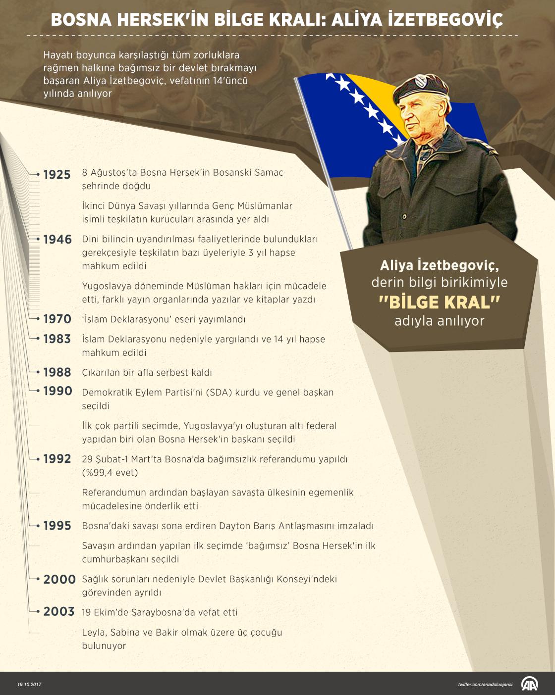 Hayatı boyunca karşılaştığı tüm zorluklara rağmen halkına bağımsız bir devlet bırakmayı başaran Aliya İzzetbegoviç, vefatının 14'üncü yılında anılıyor. 1925 yılında Bosna Hersek'te doğan Aliya İzetbegoviç, hayatı boyunca ülkedeki Müslümanların hakları için mücadele etti, yazılar ve kitaplar yazdı. Bosna'daki savaşta halkına liderlik eden ve "bağımsız" Bosna Hersek'in ilk cumhurbaşkanı olan Aliya, sağlık sorunları nedeniyle 2000 yılında görevinden ayrıldıktan sonra 2003 yılında yaşamını yitirdi.