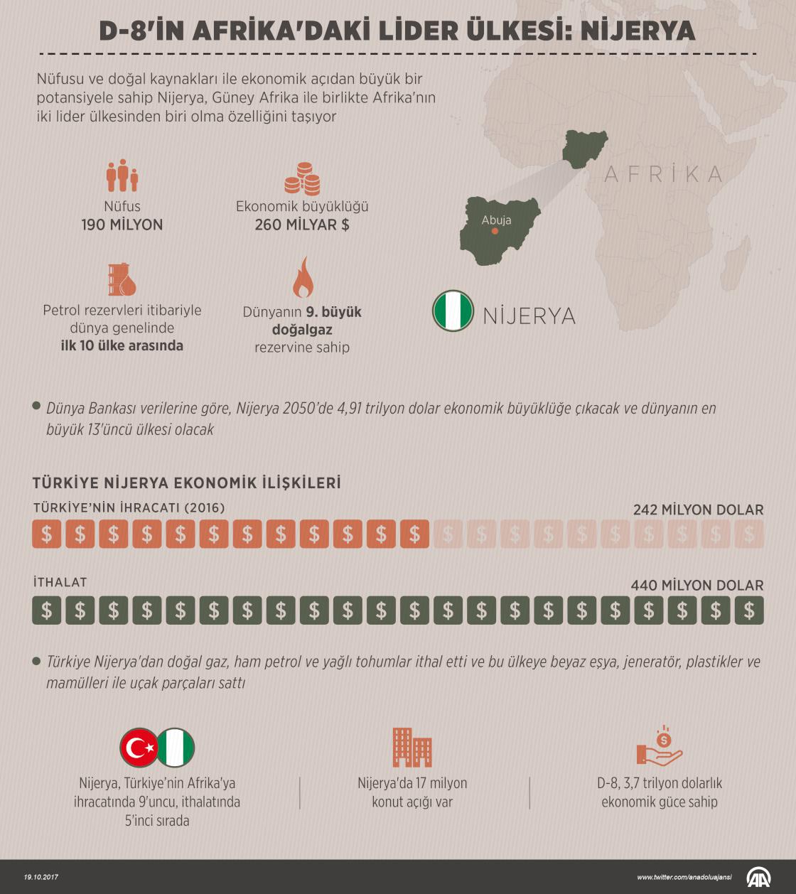 Türkiye'nin ev sahipliğinde İstanbul'da bugün başlayan ve yarın da devam edecek "İşbirliği ile Fırsatları Çoğaltmak" temasıyla düzenlenen Gelişen Sekiz Ülke (D-8) Ekonomik İşbirliği Örgütü 9. Zirvesi'ne Afrika'nın en büyük ekonomisine sahip ülkeleri arasında gösterilen üye ülke Nijerya da katılıyor.