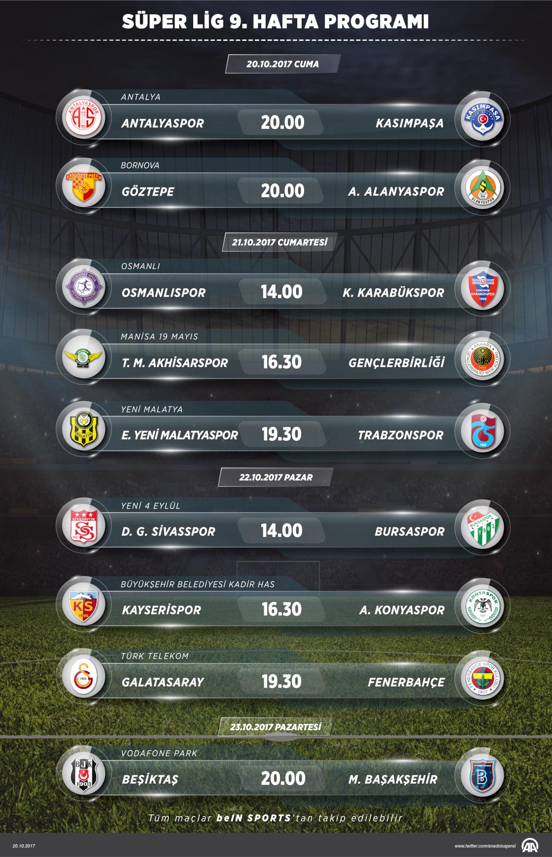 Süper Lig'de 9. haftanın açılış maçında bugün (20 Ekim 2017 Cuma) Antalyaspor ile Kasımpaşa ve Göztepe ile Aytemiz Alanyaspor karşı karşıya gelecek. Ligde 21 Ekim Cumartesi 3, 22 Ekim Pazar günü 3 ve 23 Ekim Pazartesi tek maç oynanacak. ( Kemal Delikmen - Anadolu Ajansı )20 Ekim 2017•Güncelleme: 20 Ekim 2017