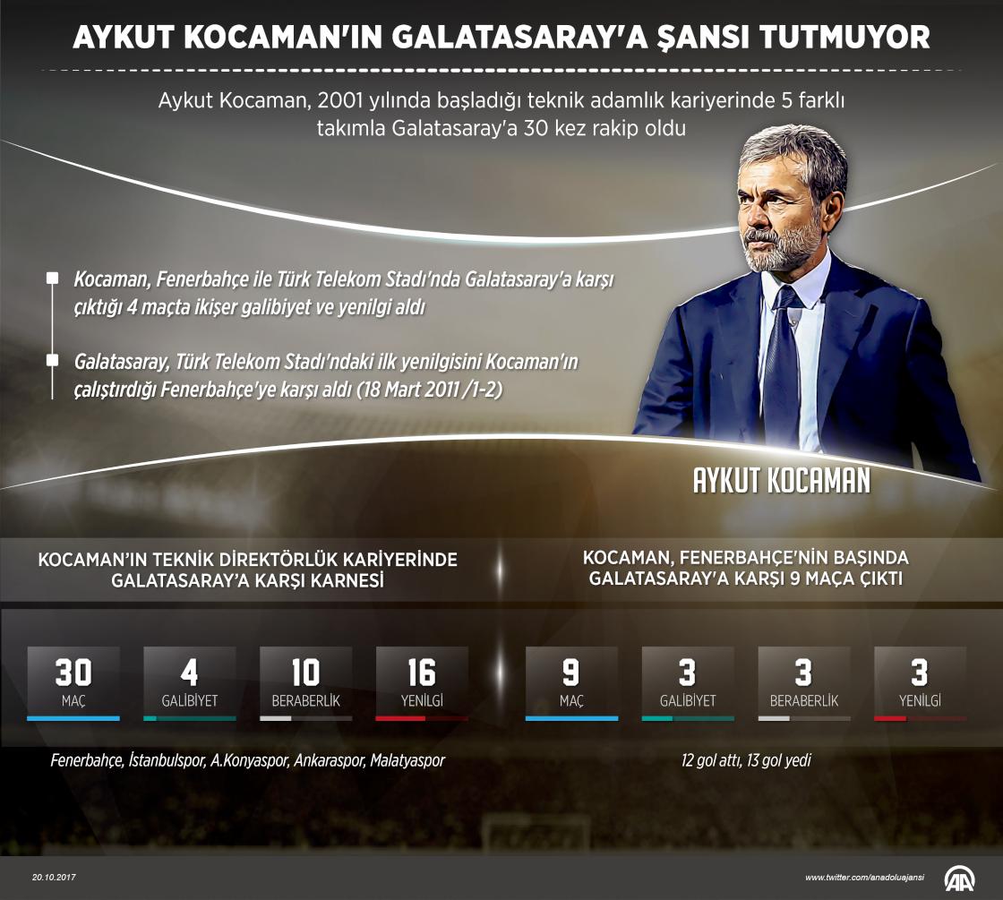 Fenerbahçe Teknik Direktörü Aykut Kocaman, Süper Lig'in 9. haftasında 22 Ekim'de konuk olacakları Galatasaray'a karşı teknik adamlık kariyerinde 30 resmi maçta sadece 4 kez galibiyet sevinci yaşadı. Aykut Kocaman, 2001 yılında başladığı teknik adamlık kariyerinde 5 farklı takımla Galatasaray'a 30 kez rakip oldu. Tecrübeli teknik adam, resmi maçlarda sarı-kırmızılılara karşı 4 galibiyet elde ederken 10 beraberlik ve 16 yenilgi gördü. Kocaman, Fenerbahçe ve Atiker Konyaspor ile dokuzar, İstanbulspor ile altı, Ankaraspor ile beş, Malatyaspor ile ise bir kez Galatasaray'a rakip oldu. ( Kemal Delikmen - Anadolu Ajansı )20 Ekim 2017•Güncelleme: 20 Ekim 2017