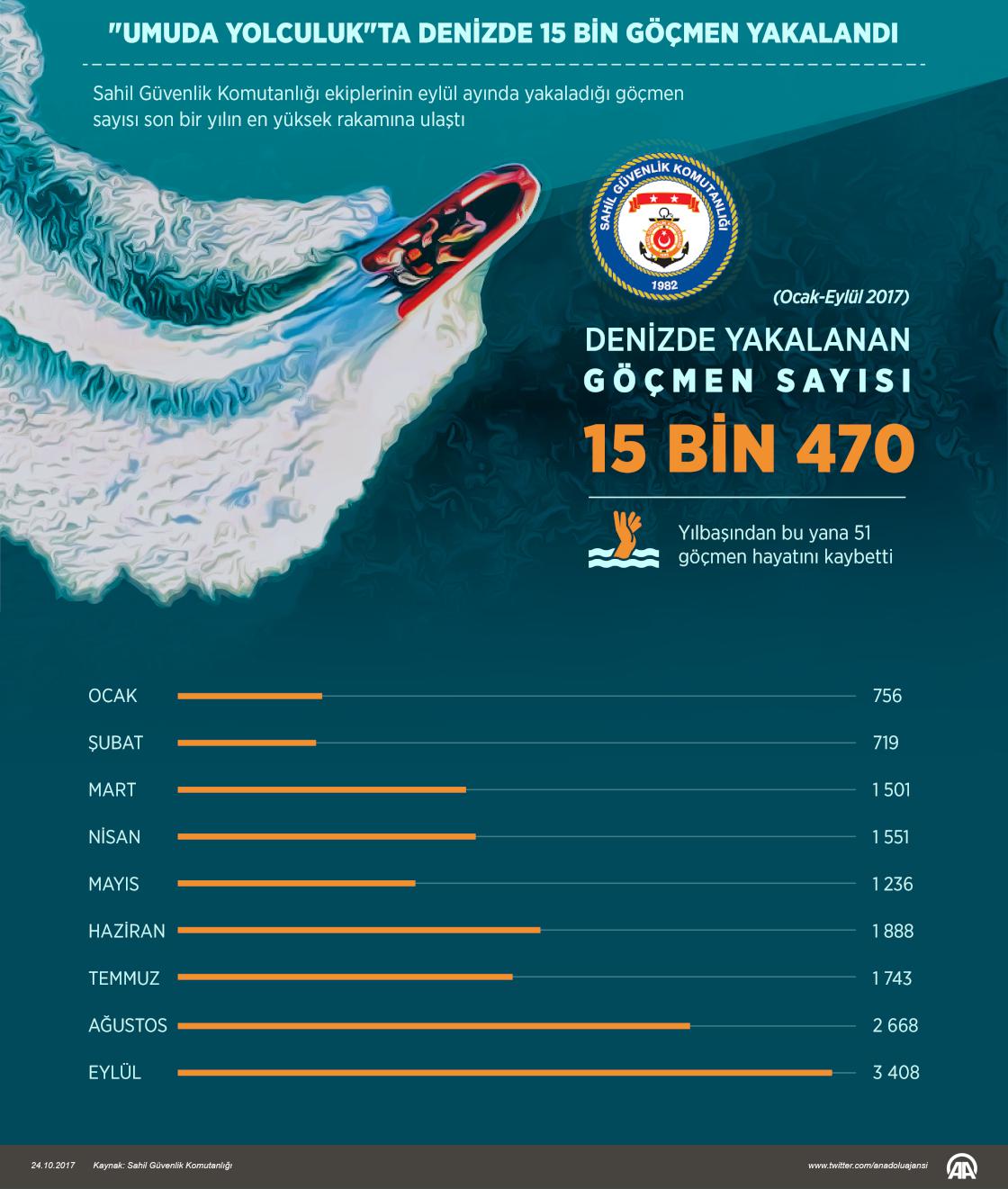 Sahil Güvenlik Komutanlığı ekiplerinin eylül ayında yakaladığı göçmen sayısı, son bir yılın en yüksek rakamına ulaştı. Ekiplerin yakaladığı göçmen sayısı, eylül ayında 3 bin 408, yılın 9 ayında ise 15 bin 470 oldu. Bindikleri deniz araçlarının batması ya da alabora olması sonucu yılbaşından bu yana 51 kişi hayatını kaybetti. ( Ahmet Burak Özkan - Anadolu Ajansı )24 Ekim 2017•Güncelleme: 24 Ekim 2017