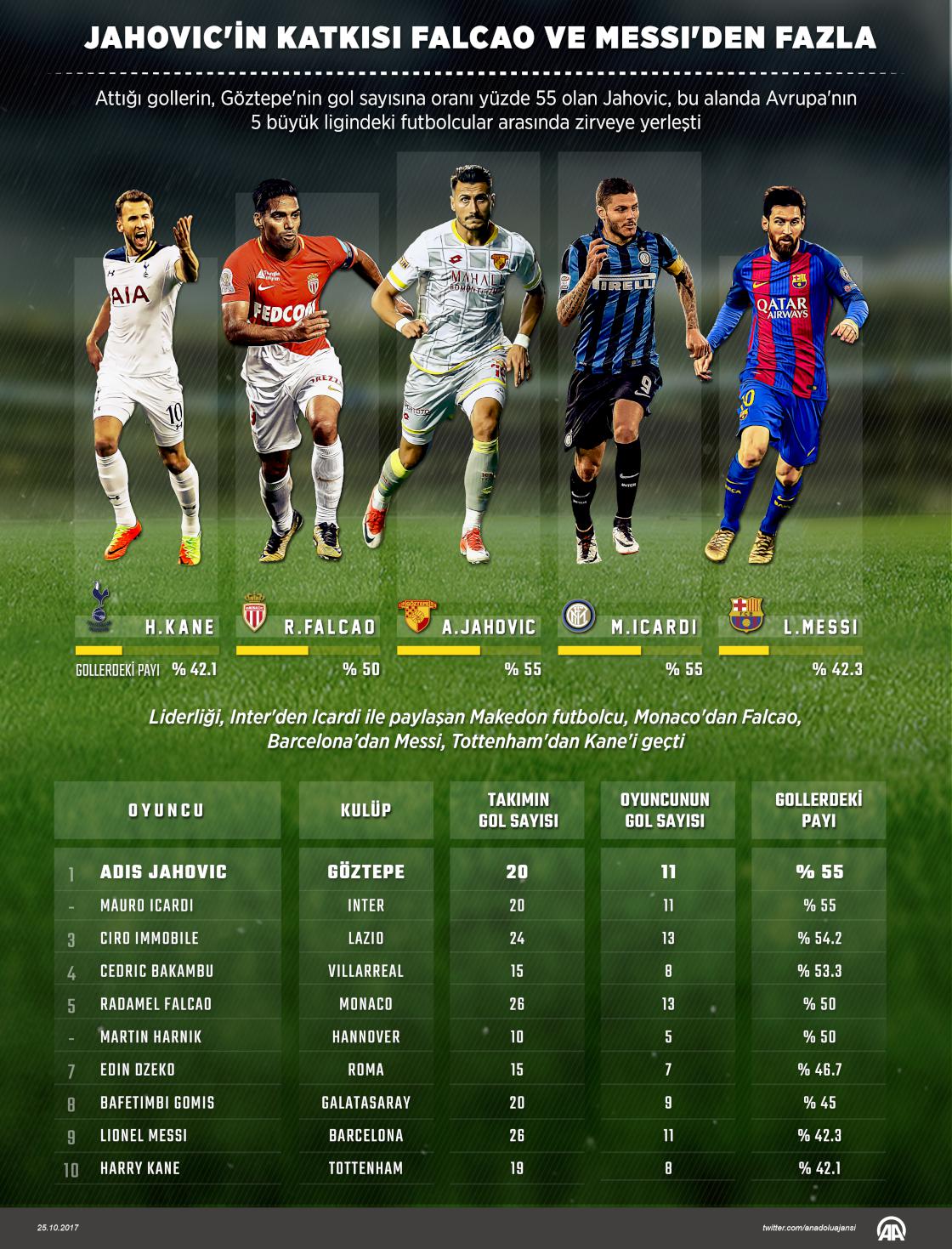Göztepe'nin Makedon forvet oyuncusu Adis Jahovic, Avrupa'nın 5 büyük liginde, takımlarının attığı gollerin çoğunda imzası bulunan futbolcular arasında başı çekti. Göztepe'nin Süper Lig'e çıkmasında büyük pay sahibi olan Jahovic, 2017-18 sezonuna da iyi bir giriş yaptı. Makedonya Milli Takımı formasını 15 kez giyen Jahovic, ligin ilk 9 haftasında fileleri 11 kez havalandırdı. Son 7 maçtır gol atan 30 yaşındaki futbolcu, Süper Lig'deki gol krallığı yarışında ilk sırada yer aldı. Göztepe'nin 20 golünün 11'ini atan Jahovic'in, gollerinin, takımının toplam üretimine oranı yüzde 55 oldu. ( Kemal Delikmen - Anadolu Ajansı )25 Ekim 2017•Güncelleme: 25 Ekim 2017