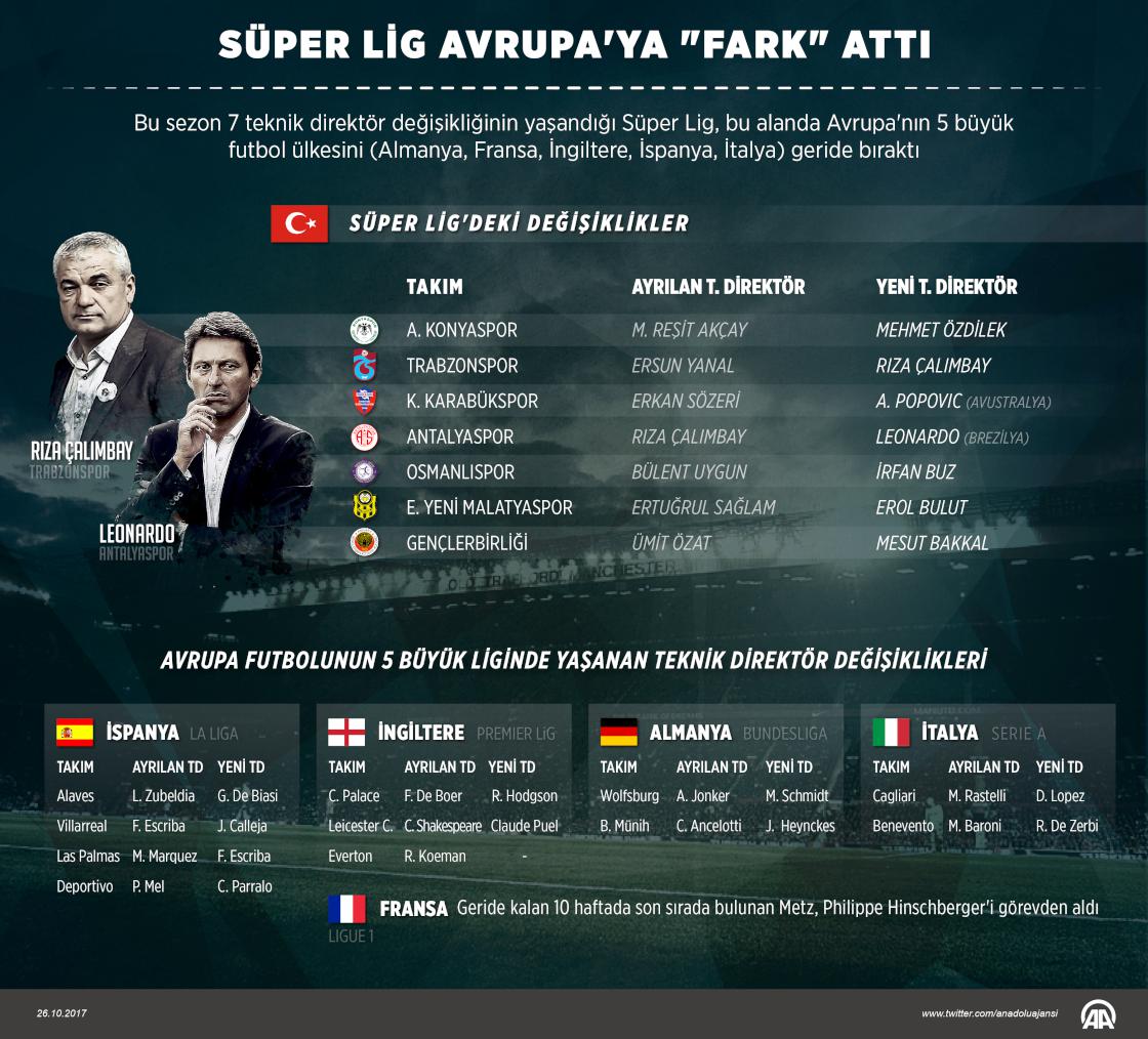 Bu sezon 7 teknik direktör değişikliğinin yaşandığı Süper Lig, bu alanda Avrupa'nın 5 büyük futbol ülkesini (Almanya, Fransa, İngiltere, İspanya, İtalya) geride bıraktı. Bu alanda Türkiye'ye en yakın ülke, 4 teknik adam değiştiren İspanya oldu. Şu ana kadar İngiltere'de 3, Almanya ve İtalya'da ikişer, Fransa'da ise bir teknik adam değişti. ( Kemal Delikmen - Anadolu Ajansı )26 Ekim 2017•Güncelleme: 26 Ekim 2017