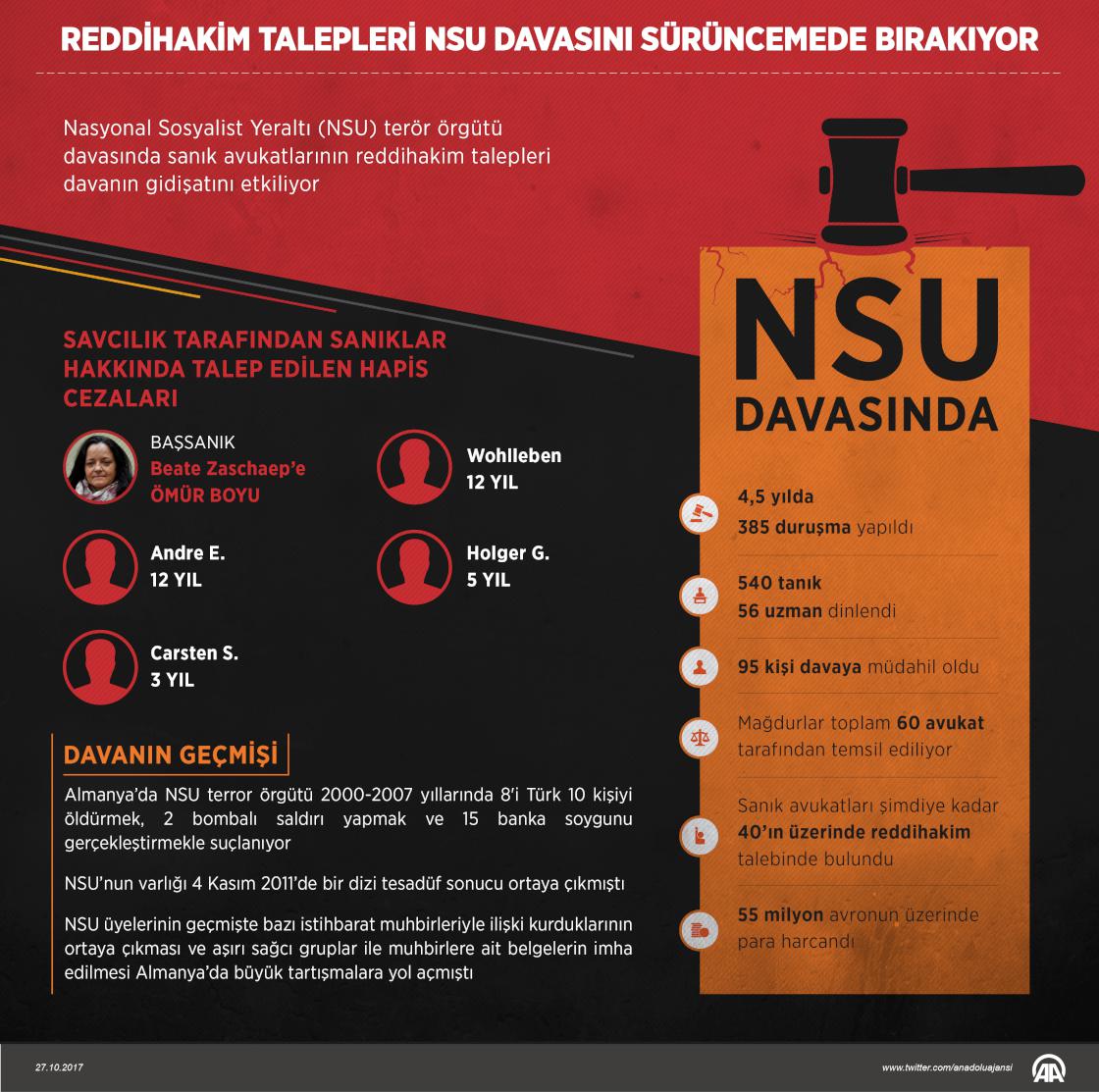 Almanya’da 8’i Türk, 10 kişiyi öldürmek, banka soymak ve bombalı saldırılarda bulunmakla suçlanan Nasyonal Sosyalist Yeraltı (NSU) terör örgütü davasında sanık avukatlarının reddihakim talepleri davanın gidişatını etkiliyor. Münih Yüksek Eyalet Mahkemesi’nde 4,5 yıldır devam eden davada şimdiye kadar 385 duruşma yapıldı. ( Yasin Demirci - Anadolu Ajansı )27 Ekim 2017•Güncelleme: 27 Ekim 2017