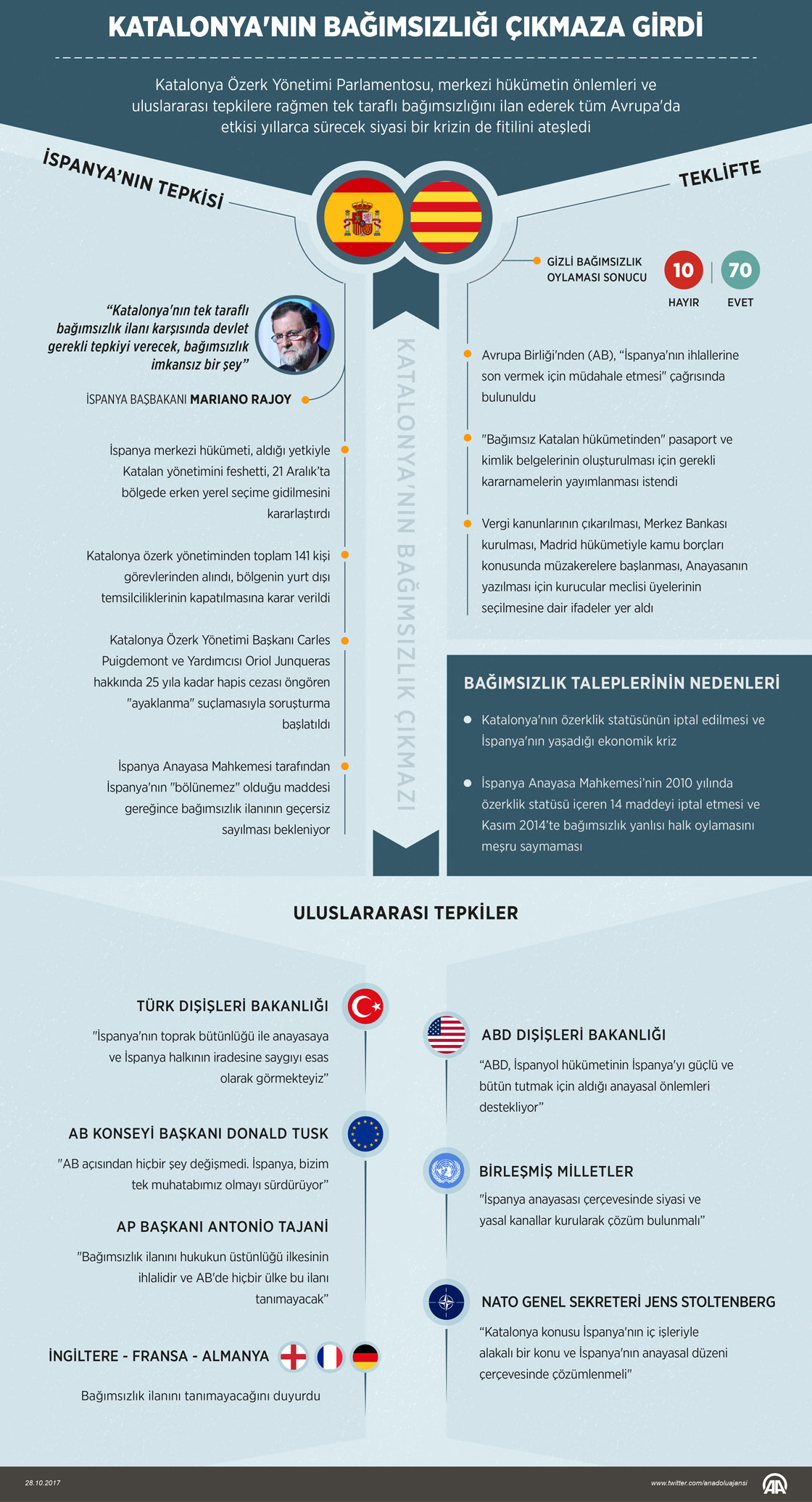Katalonya Özerk Yönetimi, tek taraflı bağımsızlık ilan etti. İspanya Senatosu, yerel hükümetin feshedilmesi ve 6 ay içinde erken yerel seçime gidilmesini öngören anayasanın 155. maddesini uygulaması için merkezi hükümete yetki verdi. Katalonya Özerk Yönetimi Başkanı Puigdemont ve Yardımcısı Junqueras hakkında 25 yıla kadar hapis cezası öngören"ayaklanma" suçlamasıyla soruşturma başlatıldı. Yasal temelden yoksun olan ve merkezi hükümetin sert tepkisiyle karşılaşan bağımsızlık ilanı, uluslarası arenada da kabul görmedi. ( Ahmet Burak Özkan - Anadolu Ajansı )28 Ekim 2017•Güncelleme: 28 Ekim 2017