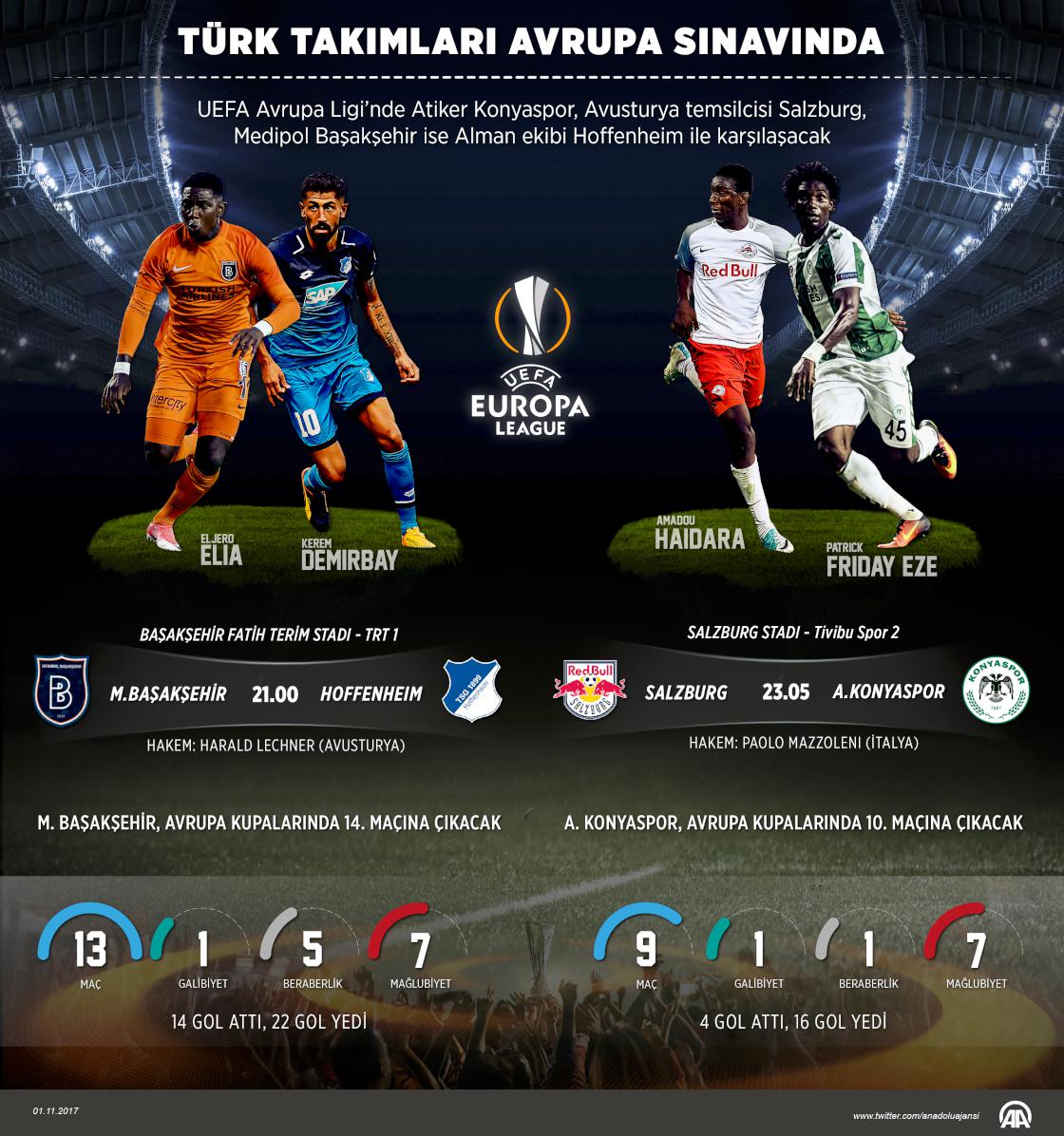 UEFA Avrupa Ligi'nde 4. hafta maçları yarın yapılacak. Avrupa futbolunun kulüp düzeyindeki ikinci organizasyonu Avrupa Ligi'nin 4. haftasında yarın 24 maç oynanacak. C Grubu'nda yer alan Medipol Başakşehir, saat 21.00'de başlayacak maçta Almanya temsilcisi Hoffenheim'ı konuk edecek. Atiker Konyaspor ise TSİ 23.05'te oynanacak I Grubu mücadelesinde, Avusturya'nın Salzburg ekibiyle deplasmanda karşılaşacak. ( Kemal Delikmen - Anadolu Ajansı )01 Kasım 2017•Güncelleme: 01 Kasım 2017