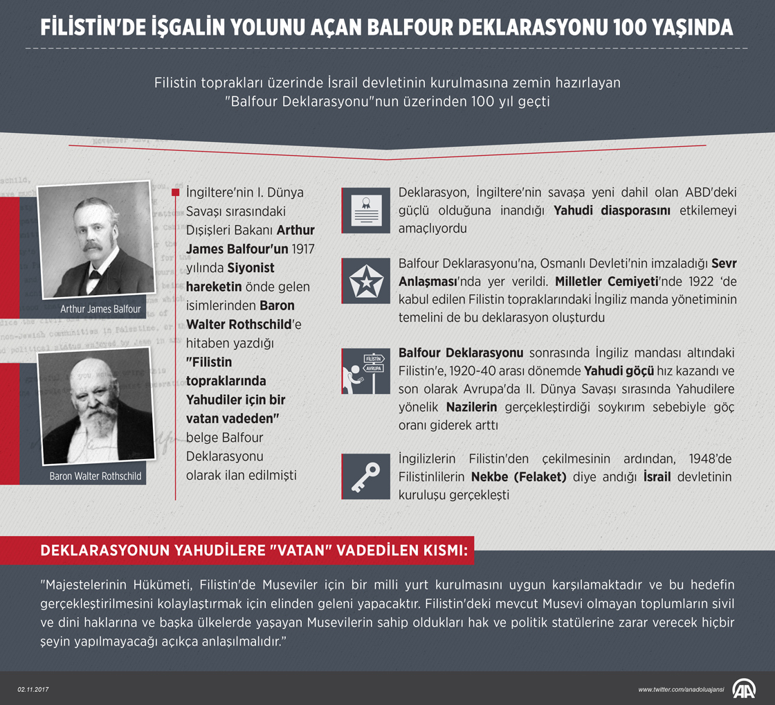 Filistin toprakları üzerinde İsrail devletinin kurulmasına zemin hazırlayan "Balfour Deklarasyonu"nun üzerinden 100 yıl geçti. Dönemin İngiltere Dışişleri Bakanı Arthur James Balfour, Siyonist hareketin önemli isimlerinden Baron Walter Rothschild'e 100 yıl önce bugün (2 Kasım 1917) yazdığı mektupta Filistin topraklarında Yahudilere bir "vatan" kurulmasını vadediyordu. "Halksız vatana, vatansız halkı yerleştirme" söylemiyle yapılan kampanyalar çerçevesinde yazılan mektubun ardından tarihi Filistin topraklarına büyük bir Yahudi göçü başlatıldı. ( Muhammed Ali Yiğit - Anadolu Ajansı )02 Kasım 2017•Güncelleme: 02 Kasım 2017