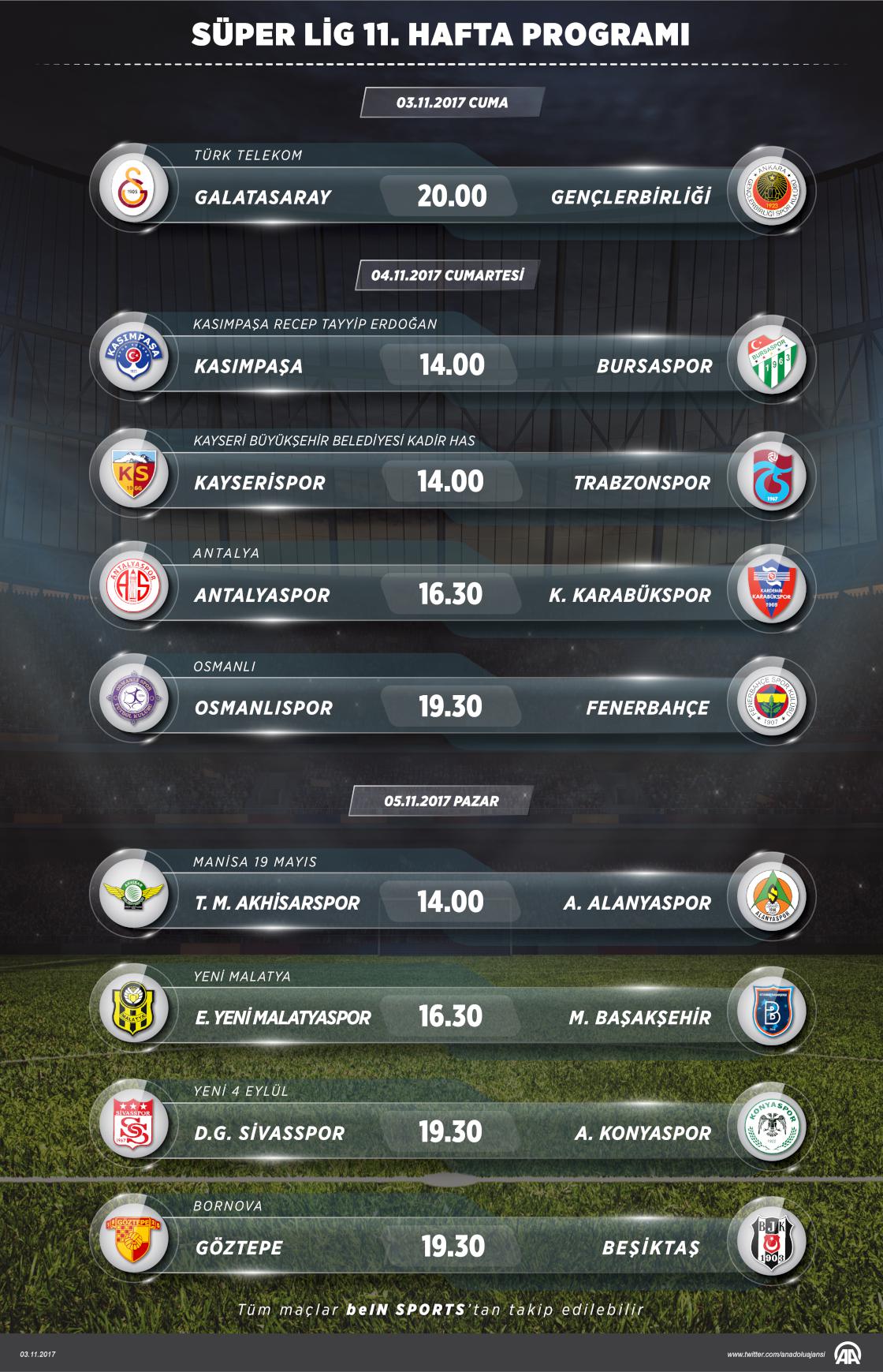 Süper Lig'de 11. haftanın açılış maçında bugün Galatasaray ile Gençlerbirliği karşı karşıya gelecek. Ligde 04 Kasım Cumartesi ve 05 Kasım Pazar günü 4'er maç oynanacak. ( Kemal Delikmen - Anadolu Ajansı )
