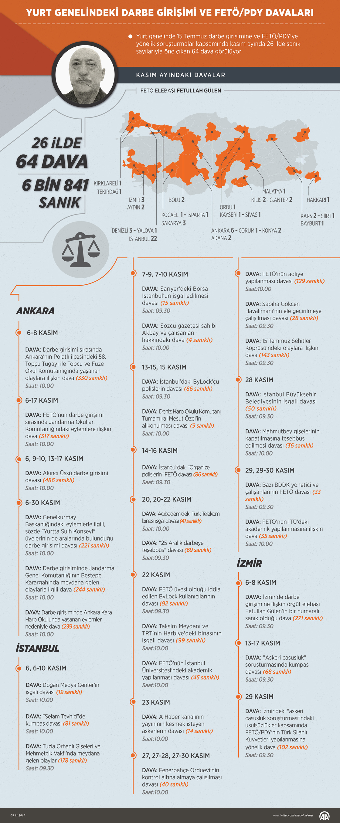 Yurt genelinde FETÖ'nün 15 Temmuz darbe girişimi ve FETÖ/PDY'ye yönelik soruşturmalar kapsamında kasım ayında 26 ilde sanık sayılarıyla öne çıkan 64 dava görülüyor. Çoğunluğu İstanbul ve Ankara'daki davalarda 6 bin 841 sanığın yargılanmasına devam edilecek. ( Ahmet Burak Özkan - Anadolu Ajansı )05 Kasım 2017•Güncelleme: 05 Kasım 2017