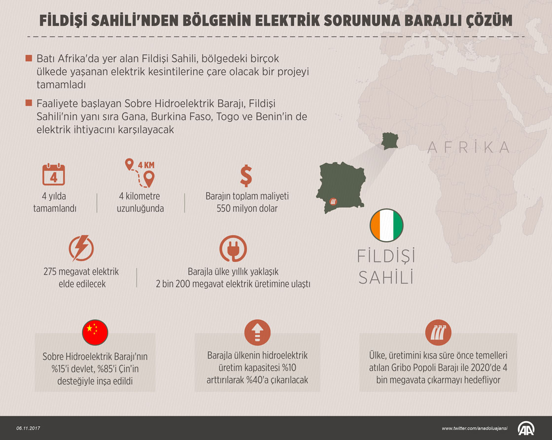 Batı Afrika ülkesi Fildişi Sahili, tamamlanan ve yapımı devam eden hidroelektrik barajlarıyla kıtadaki birçok ülkenin elektrik ihtiyacına cevap verecek. Fildişi Sahili, yıllarca süren siyasi sorunların ardından hızla büyüyen ekonomisini desteklemek üzere enerji altyapısına büyük yatırım yapıyor. Üretime başlayan Sobre Hidroelektrik Barajı, inşa edildiği toprakların yanı sıra komşu ülkeler Gana, Burkina Faso, Togo ve Benin'e de elektrik sağlayacak.