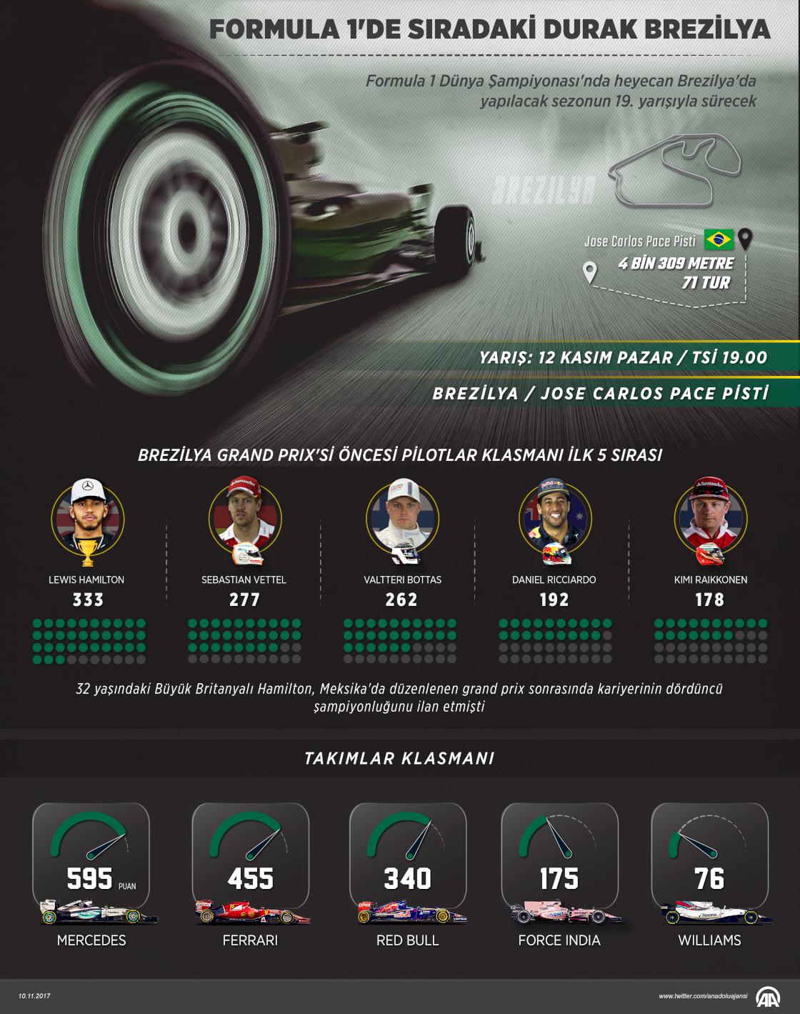Formula 1 Dünya Şampiyonası'nda heyecan Brezilya'da yapılacak sezonun 19. yarışıyla sürecek. Sao Paulo'nun 4 bin 309 metrelik Jose Carlos Pace Pisti'nde, 71 tur üzerinden yapılacak Brezilya Grand Prix'sinin sıralama turları yarın TSİ 19.00'da, yarış ise 12 Kasım Pazar günü aynı saatte başlayacak. Sezonun şu ana kadar koşulan 18 yarışında Avustralya, Bahreyn, Monaco ve Macaristan'da Ferrari pilotu Sebastian Vettel, Çin, Kanada, İspanya, Büyük Britanya, Belçika, İtalya, Singapur, Japonya ve ABD'de Mercedes pilotu Lewis Hamilton, Rusya ve Avusturya'da Valtteri Bottas, Azerbaycan'da Daniel Ricciardo, Malezya ve Meksika'da ise Max Verstappen kürsünün zirvesine çıktı. ( Kemal Delikmen - Anadolu Ajansı )10 Kasım 2017•Güncelleme: 10 Kasım 2017