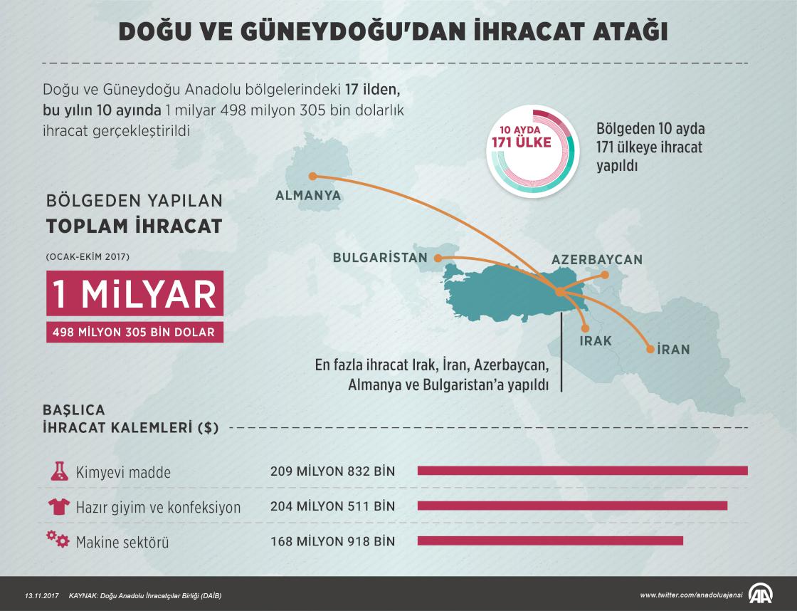 DAİB verilerinden yapılan derlemeye göre, bu yılın ocak-ekim döneminde Doğu ve Güneydoğu Anadolu bölgelerindeki 17 ilden bu yılın 10 ayında 1 milyar 498 milyon 305 bin dolarlık ihracat gerçekleştirildi. Aynı süreçte DAİB'in sektörler bazındaki ihracatında ise ilk sırada 209 milyon 832 bin dolarla kimya sektörü yer aldı. Bu sektörü 204 milyon 511 bin dolarla hazır giyim ve konfeksiyon, 168 milyon 918 bin dolarla da makine sektörü izledi. ( Ahmet Burak Özkan - Anadolu Ajansı )13 Kasım 2017•Güncelleme: 13 Kasım 2017
