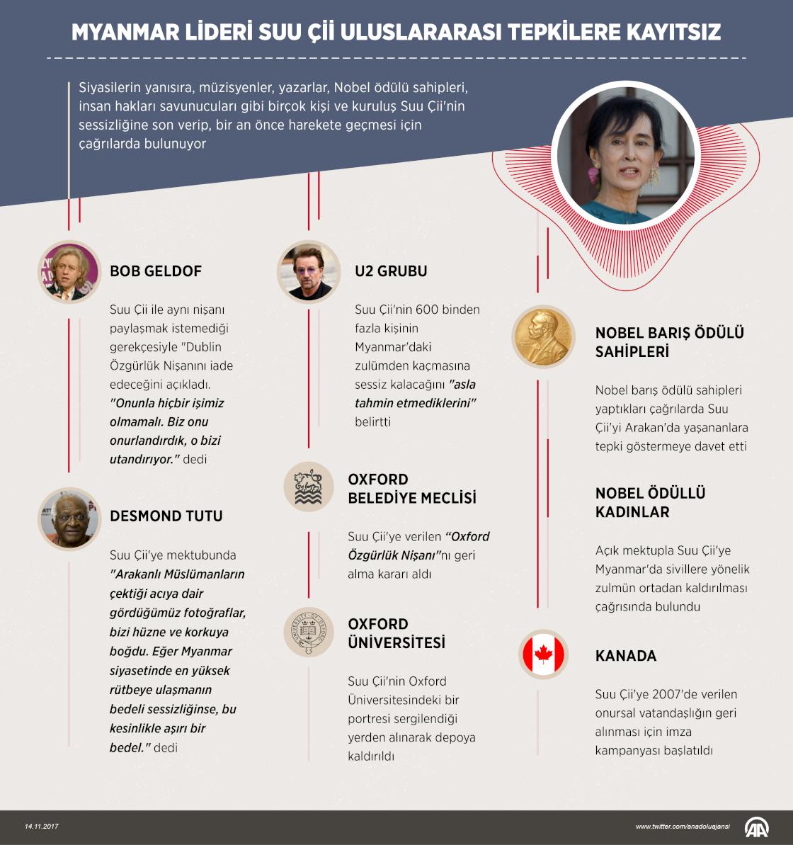 Suu Çii'nin Arakan'daki zulme sessizliği uluslararası toplumun tepkisini çekiyor. Siyasilerin yanı sıra, müzisyenler, yazarlar, Nobel ödülü sahipleri, insan hakları savunucuları gibi birçok kişi ve kuruluş Suu Çii'ye sessizliğe son verip, bir an önce harekete geçmesi için çağrılarda bulunuyor. İrlandalı müzisyen Gendolf ve U2 grubu Suu Çii'ye tepkilerini ortaya koyan son isimler. ( Ahmet Burak Özkan - Anadolu Ajansı )14 Kasım 2017•Güncelleme: 14 Kasım 2017