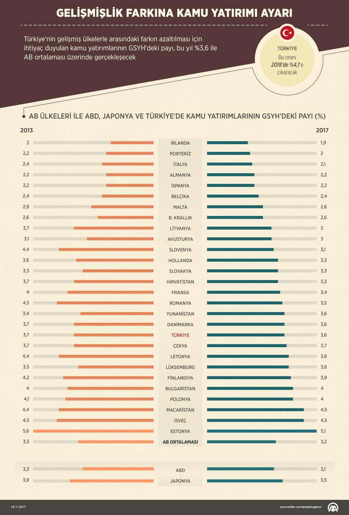 Türkiye'nin sosyal ve fiziki altyapısının geliştirilmesi, çevrenin korunması, gelişmiş ülkelerle ve bölgeler arasındaki gelişmişlik farkının azaltılması için gereken kamu yatırımlarının Gayri Safi Yurtiçi Hasıla (GSYH) içindeki payının bu yıl yüzde 3,6 ile Avrupa Birliği (AB) ortalamasının üzerinde gerçekleşmesi bekleniyor. ( Ahmet Burak Özkan - Anadolu Ajansı )16 Kasım 2017•Güncelleme: 16 Kasım 2017