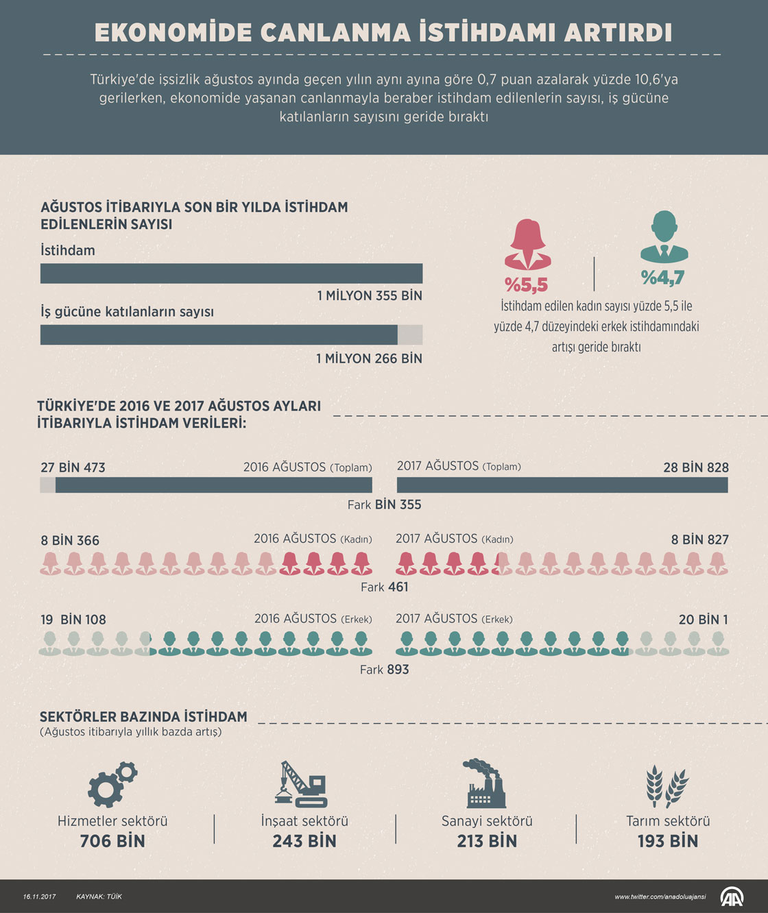 Türkiye'de işsizlik ağustos ayında geçen yılın aynı ayına göre 0,7 puan azalarak yüzde 10,6'ya gerilerken, ekonomide yaşanan canlanma, istihdam edilenlerin sayısının iş gücüne katılanların sayısını geçmesini sağladı. ( Muhammed Ali Yiğit - Anadolu Ajansı )16 Kasım 2017•Güncelleme: 16 Kasım 2017