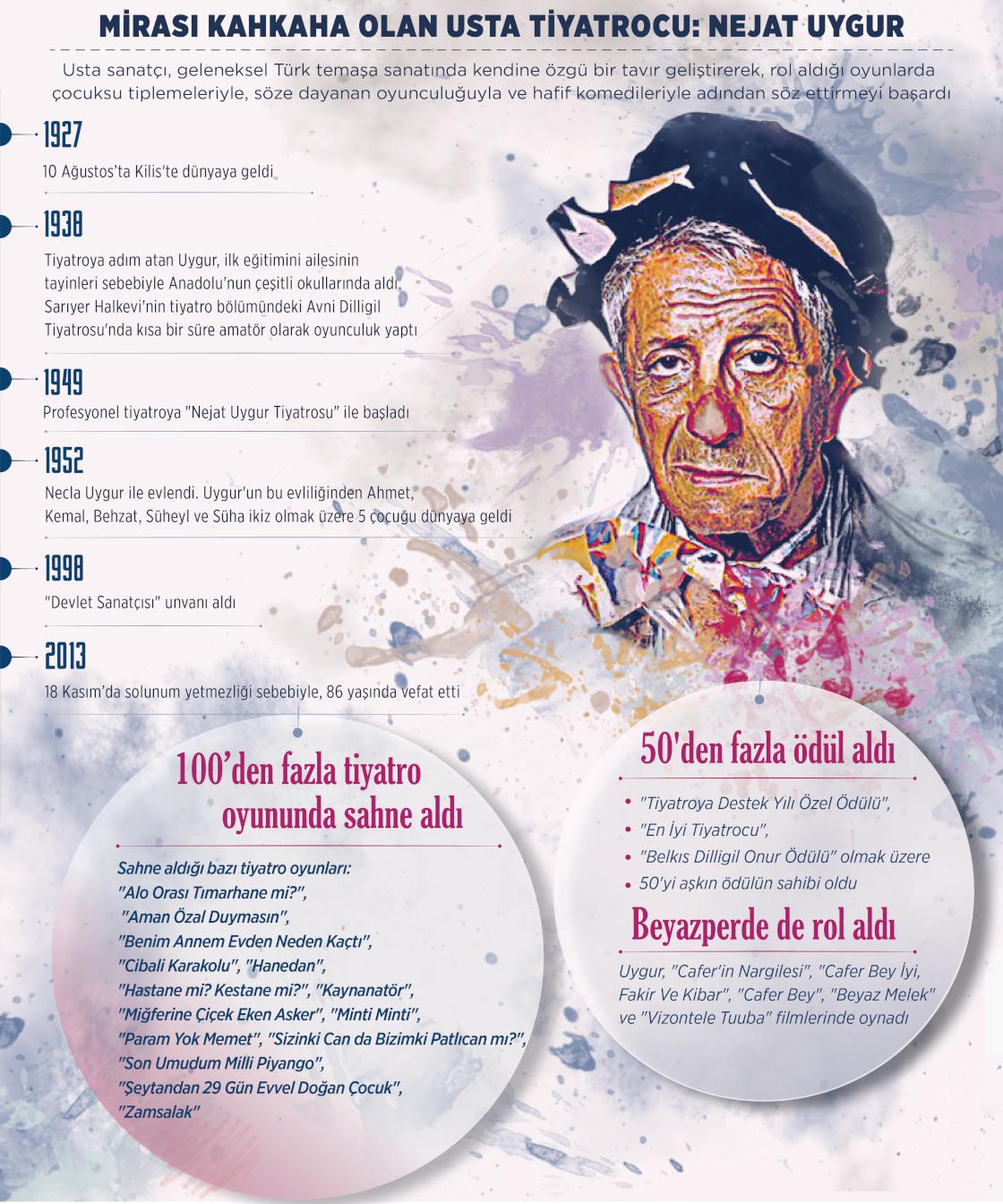 Sinema, tiyatro, dizi oyuncusu ve komedyen Nejat Uygur, vefatının 4'üncü yılında anılıyor. Türk tiyatrosuna 60 yılı aşkın emek veren usta sanatçı Nejat Uygur, başta Altın Kelebek TV Yıldızları Yarışması kapsamındaki "Tiyatroya Destek Yılı Özel Ödülü", Kemal Sunal Kültür Sanat Ödülü kapsamında "En İyi Tiyatrocu", 22. Avni Dilligil Tiyatro Ödülleri'nde "Belkıs Dilligil Onur Ödülü" olmak üzere 50'yi aşkın ödülün sahibi oldu. ( Gözde Gültekinler - Anadolu Ajansı )17 Kasım 2017•Güncelleme: 17 Kasım 2017