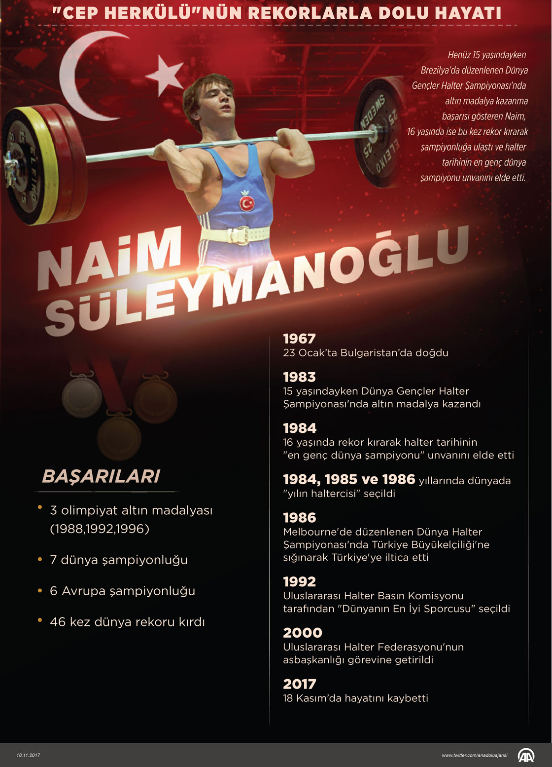 Tedavi gördüğü hastanede 50 yaşında yaşamını yitiren eski milli sporcu Naim Süleymanoğlu, 9 yaşında bağladığı halterde birçok olimpiyat ve dünya rekoruna imza attı. ( Gözde Gültekinler - Anadolu Ajansı )