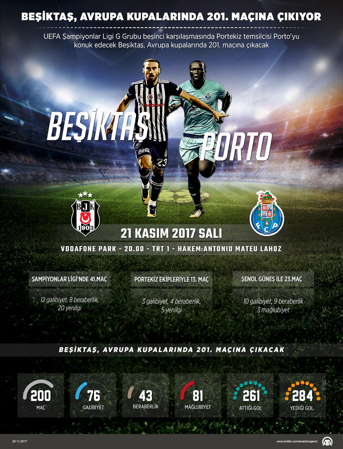 UEFA Şampiyonlar Ligi G Grubu beşinci karşılaşmasında yarın Portekiz temsilcisi Porto'yu konuk edecek Beşiktaş, Avrupa kupalarında 201. maçına çıkacak. Siyah-beyazlılar, Avrupa kupalarında geride kalan 200 maçtan 76'sını kazandı, 81'ini yitirdi, 43'ünde de berabere kaldı. Avrupa arenasındaki 200 karşılaşmada rakip fileleri 261 kez havalandıran siyah-beyazlılar, kalesinde ise 284 gol gördü. ( Kemal Delikmen - Anadolu Ajansı )20 Kasım 2017•Güncelleme: 20 Kasım 2017