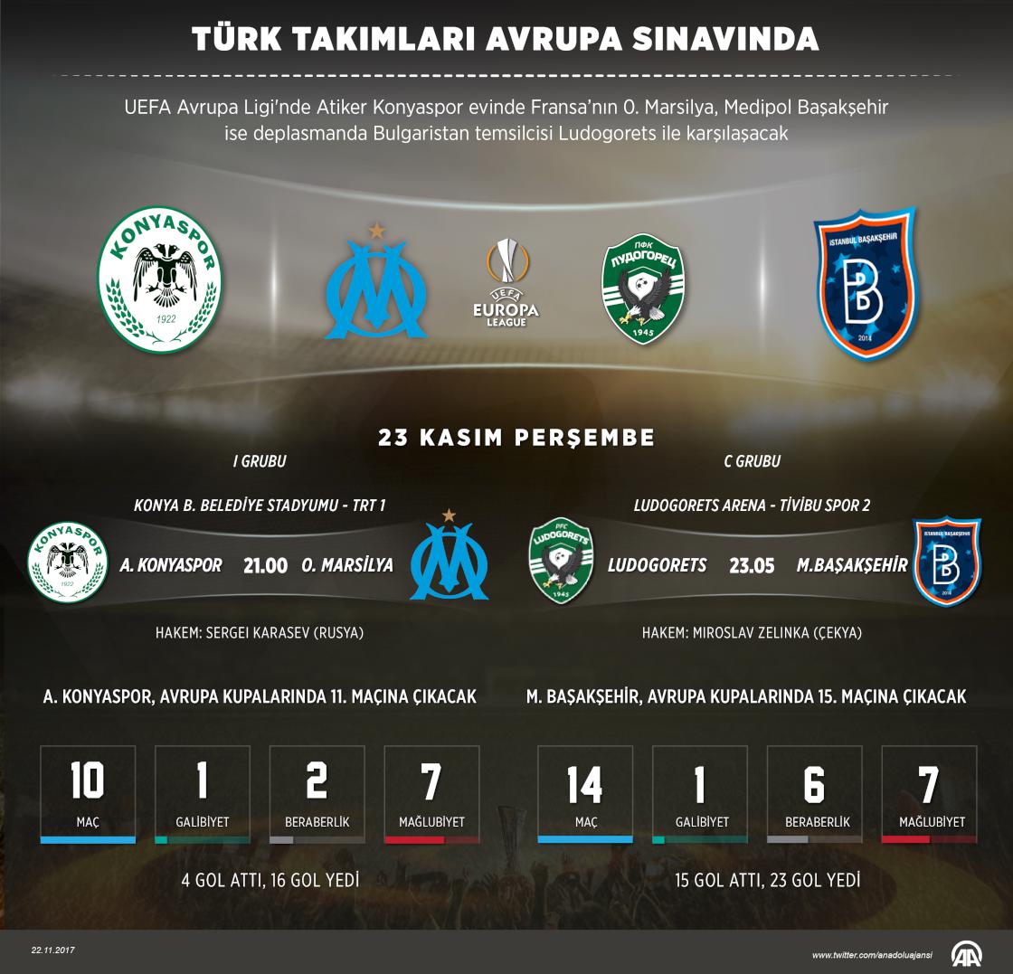 UEFA Avrupa Ligi'nde 5. hafta maçları yarın yapılacak. Avrupa futbolunun kulüp düzeyindeki ikinci organizasyonu Avrupa Ligi'nin 5. haftasında yarın 24 maç oynanacak. C Grubu'nda yer alan Medipol Başakşehir, saat 23.05'te başlayacak maçta deplasmanda Bulgar temsilcisi Ludogorets ile karşılaşacak. Atiker Konyaspor ise TSİ 21.00'de oynanacak I Grubu mücadelesinde, Fransa'nın Olympique Marsilya ekibini ağırlayacak. ( Kemal Delikmen - Anadolu Ajansı )22 Kasım 2017•Güncelleme: 22 Kasım 2017