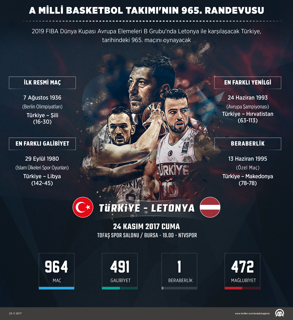 2019 FIBA Dünya Kupası Avrupa Elemeleri B Grubu'nda yarın Letonya ile karşılaşacak Türkiye, tarihindeki 965. maçını oynayacak.