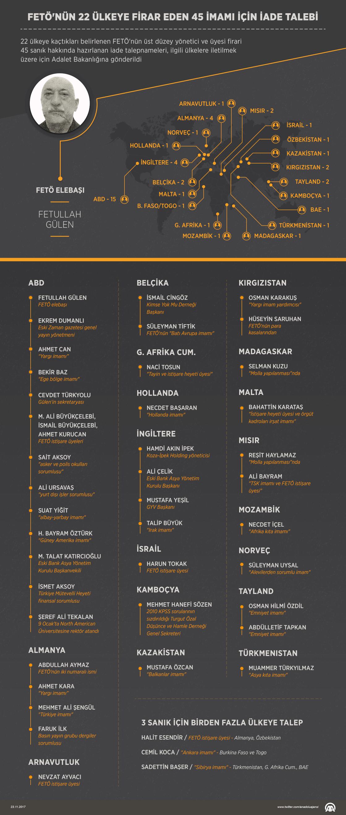 Fetullahçı Terör Örgütü/Paralel Devlet Yapılanması (FETÖ/PDY) çatı davasını gören Ankara 4. Ağır Ceza Mahkemesince, yurt dışına kaçtıkları tespit edilen örgütün üst düzey yönetici ve üyesi firari 45 sanık hakkında hazırlanan iade talepnameleri, ilgili ülkelere iletilmek üzere Adalet Bakanlığına ulaştırıldı. FETÖ'nün üst düzey yöneticileri ve üyelerinin, aralarında ABD, İngiltere, İsrail, Almanya, Belçika, Norveç, Kamboçya, Tayland, Madagaskar, Malta, Burnika Faso, Mozambik, Mısır, Türkmenistan, Kırgızistan ve Kazakistan'ın da yer aldığı 22 ülkede bulundukları tespit edildi. ( Ahmet Burak Özkan - Anadolu Ajansı )23 Kasım 2017•Güncelleme: 23 Kasım 2017