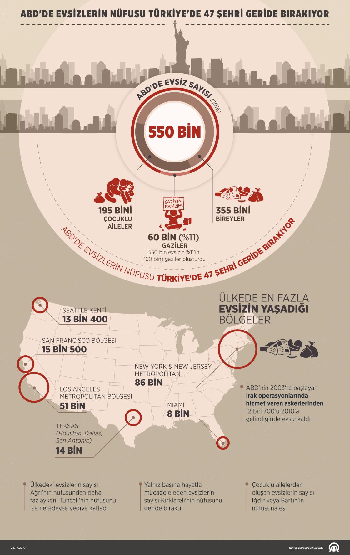 Dünyanın en büyük ekonomisi ABD'de geçen yıl yaklaşık 550 bin evsiz bulunurken, bu sayı Türkiye'nin illerinin yarısından fazlasının nüfusunu geride bırakıyor. AA muhabirinin derlediği verilere göre, ABD'deki evsiz nüfusunun Türkiye'nin 47 şehrinin geride bırakıyor. ABD Konut ve Kentsel Gelişim Bakanlığının verilerine göre, geçen sene ABD'de ortalama 550 bin evsiz bulunuyordu. Bu sayı 2016'da Ağrı'nın nüfusundan daha fazlayken, Tunceli'nin nüfusunu ise neredeyse yediye katladı. ( Murat Usubaliev - Anadolu Ajansı )25 Kasım 2017•Güncelleme: 25 Kasım 2017
