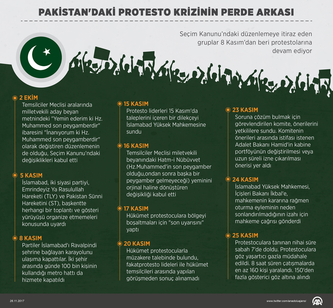 Pakistan'da aralarında "Tahrik-i Hatm-i Nübüvvet" (Son Peygamber Hareketi), "Tahrik Lebbeyk Ya Rasulullah" (Emrindeyiz Ya Rasulullah Hareketi) , Sünni Tahrik Pakistan (Pakistan Sünni Hareketi) bulunduğu siyasi partilerin, 8 Kasım'dan bu yana başkent İslamabad'ı Ravalpindi şehrine bağlayan Feyzabad Köprüsü ve çevresindeki yolları birbirine bağlayan kavşakta başlattıkları oturma eylemi geniş katılımlı protestolara dönüştü. ( Muhammed Ali Yiğit - Anadolu Ajansı )26 Kasım 2017•Güncelleme: 26 Kasım 2017