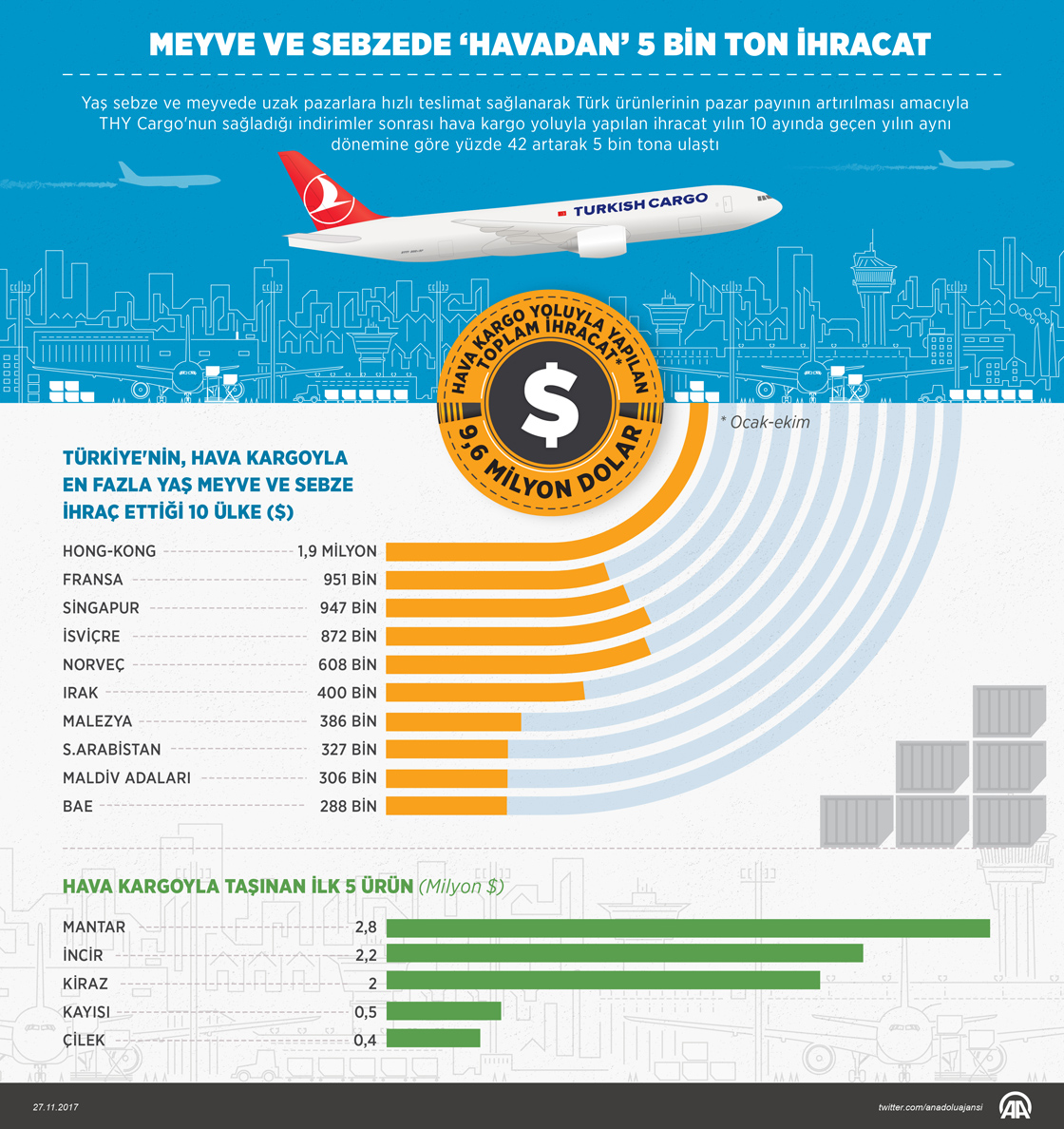 Yaş sebze ve meyve sektöründe ürünlerin tüketiciye en hızlı şekilde ulaşması ve pazar payının artırılması için Turkish Cargo ile yapılan anlaşmayla devreye sokulan hava kargo uygulaması kapsamında yılın 10 ayında yaklaşık 9,6 milyon dolarlık ihracat yapıldı. ( Murat Usubaliev - Anadolu Ajansı )27 Kasım 2017•Güncelleme: 27 Kasım 2017