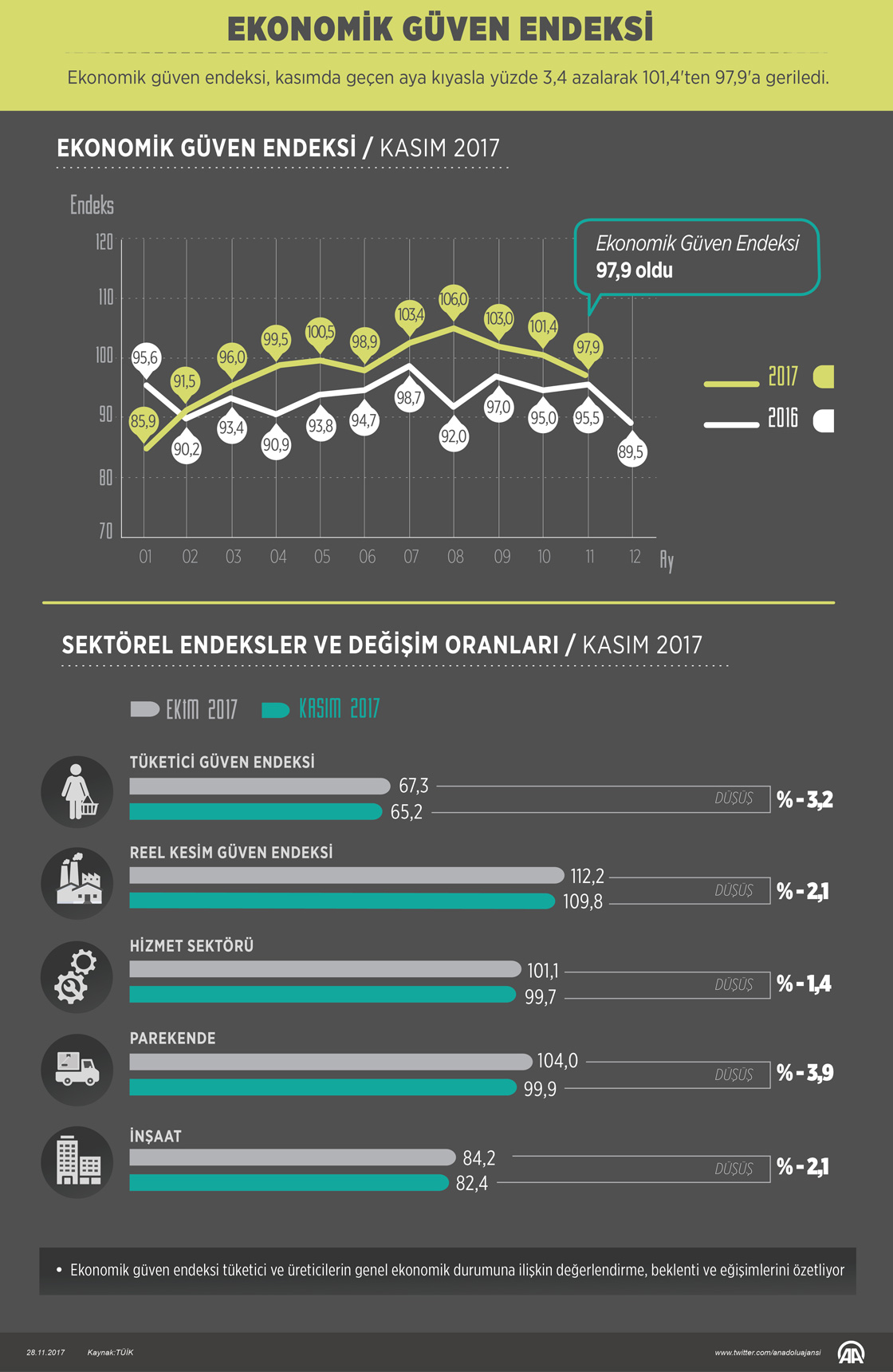 Türkiye İstatistik Kurumu (TÜİK), kasım ayına ilişkin ekonomik güven endeksini açıkladı. Ekonomik güven endeksi, kasımda geçen aya kıyasla yüzde 3,4 azalarak 101,4'ten 97,9'a geriledi. ( Gözde Gültekinler - Anadolu Ajansı )