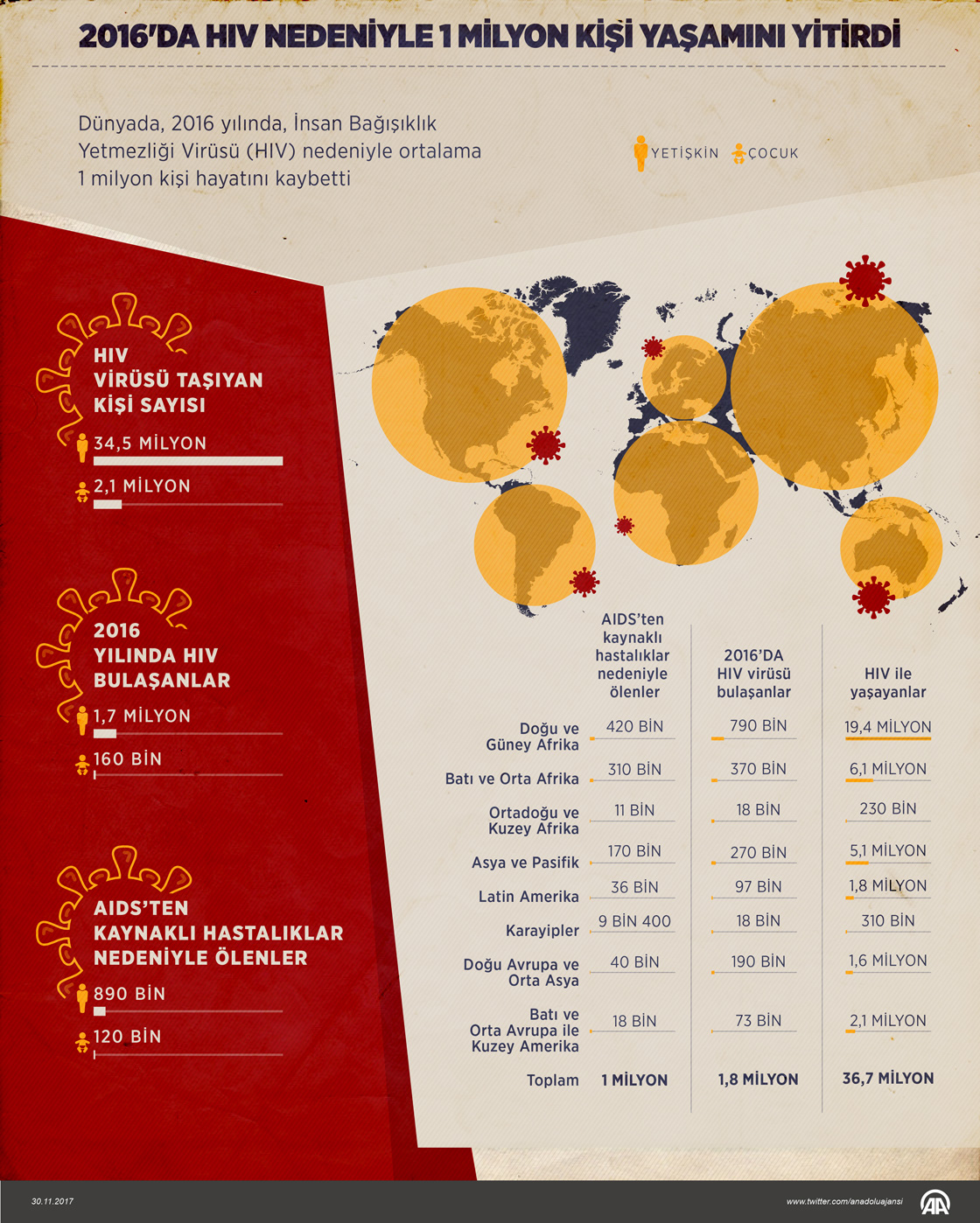 Birleşmiş Milletler HIV/AIDS Ortak Programı (UNAIDS) ve Dünya Sağlık Örgütü'nün (DSÖ) HIV verilerinin yer aldığı raporlarda, dünyada yaklaşık 36,7 milyon kişi HIV taşıyor. Geçen yıl ise yaklaşık 1,8 milyon kişiye HIV bulaştı. AIDS’ten kaynaklı hastalıklar nedeniyle yaklaşık 1 milyon kişi hayatını kaybetti. Dünyada HIV ile yaşayan yetişkinlerde tedaviye erişim oranı yüzde 54, çocuklarda yüzde 43, hamilelerde yüzde 76. ( Yasin Demirci - Anadolu Ajansı )30 Kasım 2017•Güncelleme: 30 Kasım 2017