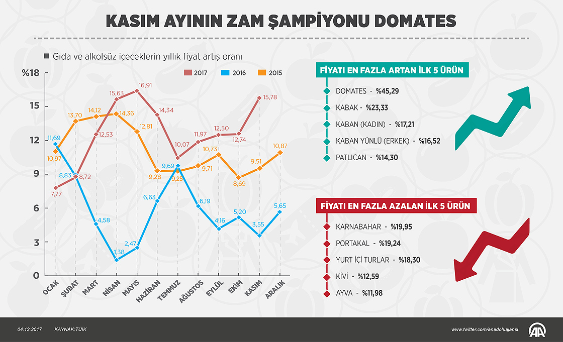Tüketici fiyatları bazında kasımda en yüksek artış yüzde 45,29 ile domateste oldu.