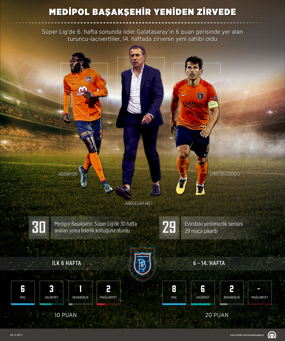 Süper Lig'de 6. hafta sonunda ligde 6. sırada yer alan Medipol Başakşehir, ekim ayından bu yana oynadığı 8 maçta 6 galibiyet ve 2 beraberlik alarak zirvenin yeni sahibi oldu. Turuncu-lacivertli takım, Galatasaray'ın Beşiktaş'a 3-0 mağlup olduğu haftada Osmanlıspor'u 1-0 mağlup ederek sarı-kırmızılıların 1 puan önünde haftayı lider tamamladı. Grafik: AA/Kemal Delikmen04 Aralık 2017•Güncelleme: 04 Aralık 2017