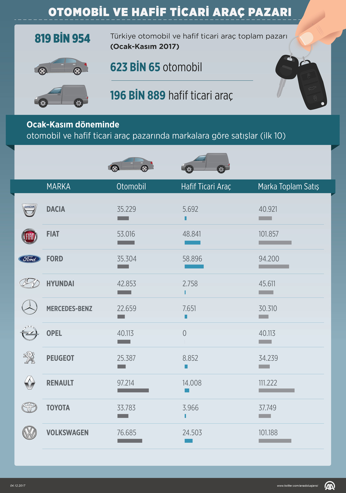 Türkiye otomobil ve hafif ticari araç toplam pazarı, 2017'nin 11 ayında geçen yılın aynı dönemine göre yüzde 2,6 daralarak 819 bin 954 olarak gerçekleşti ( Gözde Gültekinler - Anadolu Ajansı )