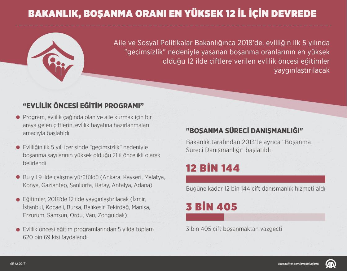 Aile ve Sosyal Politikalar Bakanlığınca 2018'de evliliğin ilk 5 yılında "geçimsizlik" nedeniyle yaşanan boşanma oranlarının en yüksek olduğu 12 ilde çiftlere verilen evlilik öncesi eğitimler yaygınlaştırılacak. ( Muhammed Ali Yiğit - Anadolu Ajansı )05 Aralık 2017•Güncelleme: 05 Aralık 2017
