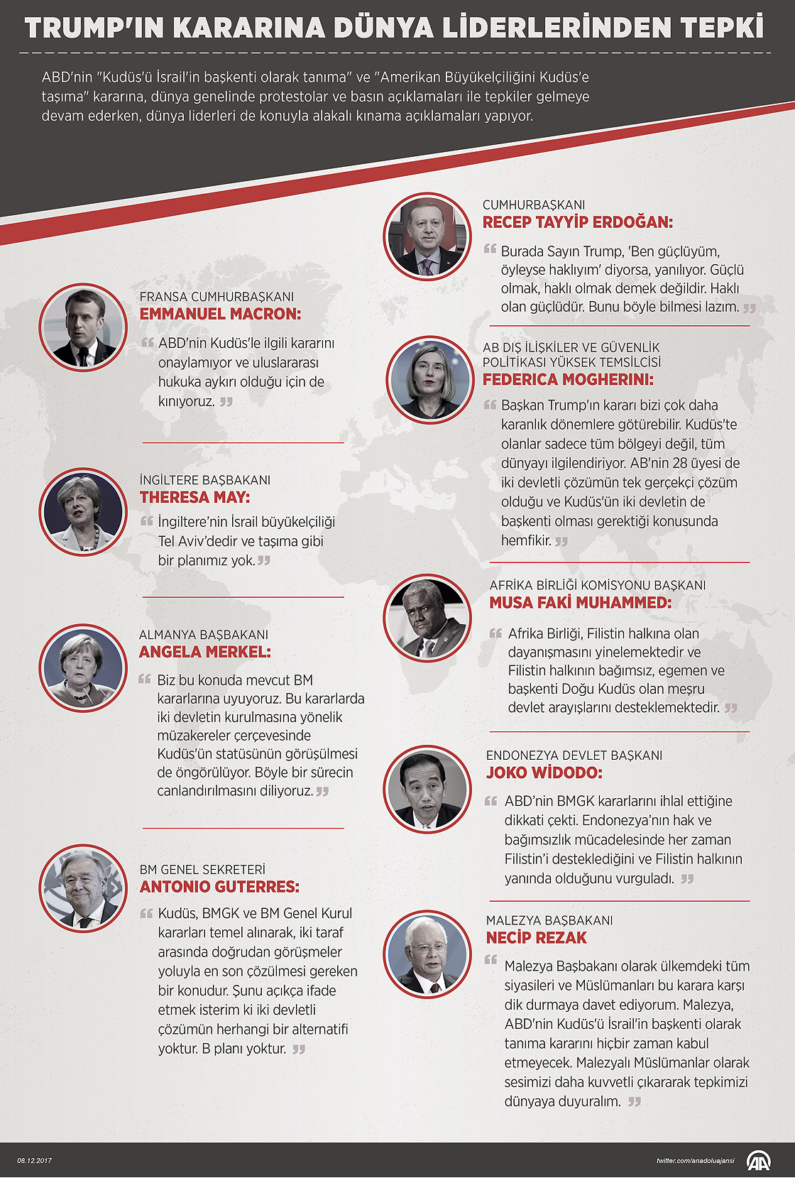 ABD'nin "Kudüs'ü İsrail'in başkenti olarak tanıma" ve "Amerikan Büyükelçiliğini Kudüs'e taşıma" kararına, dünya genelinde protestolar ve basın açıklamaları ile tepkiler gelmeye devam ederken, dünya liderleri de konuyla alakalı kınama açıklamaları yapıyor. ( Gözde Gültekinler - Anadolu Ajansı )08 Aralık 2017•Güncelleme: 08 Aralık 2017
