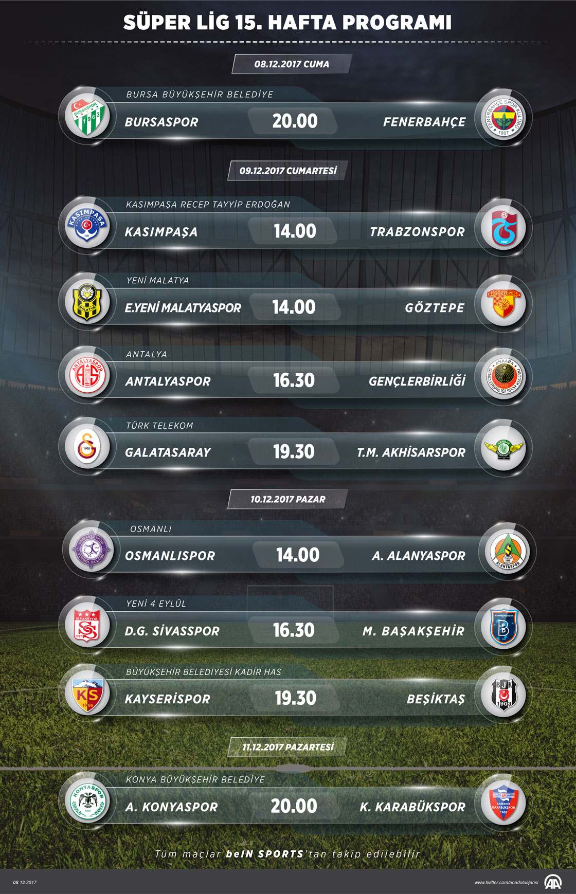 Süper Lig'de 15. haftanın açılış maçında bugün Bursaspor ile Fenerbahçe karşı karşıya gelecek. Ligde 9 Aralık Cumartesi 4, 10 Aralık Pazar günü 3 ve 11 Aralık Pazartesi tek maç oynanacak.