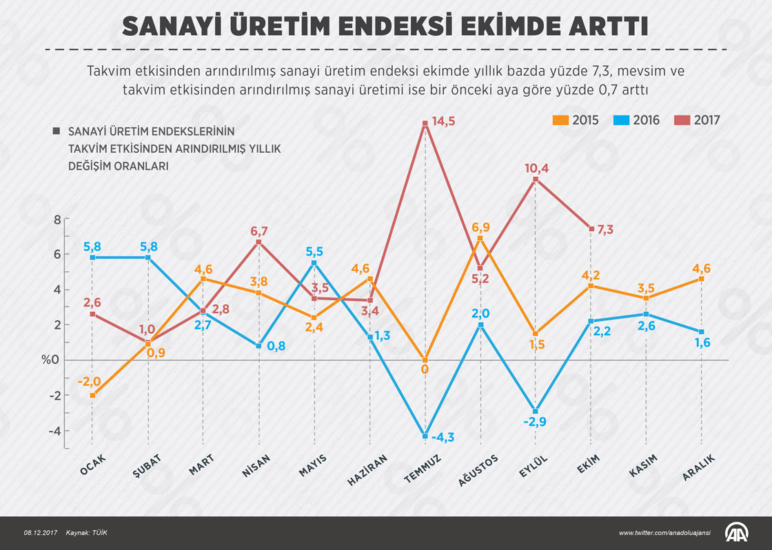 Takvim etkisinden arındırılmış sanayi üretim endeksi ekimde yıllık bazda yüzde 7,3, mevsim ve takvim etkisinden arındırılmış sanayi üretimi ise bir önceki aya göre yüzde 0,7 arttı.