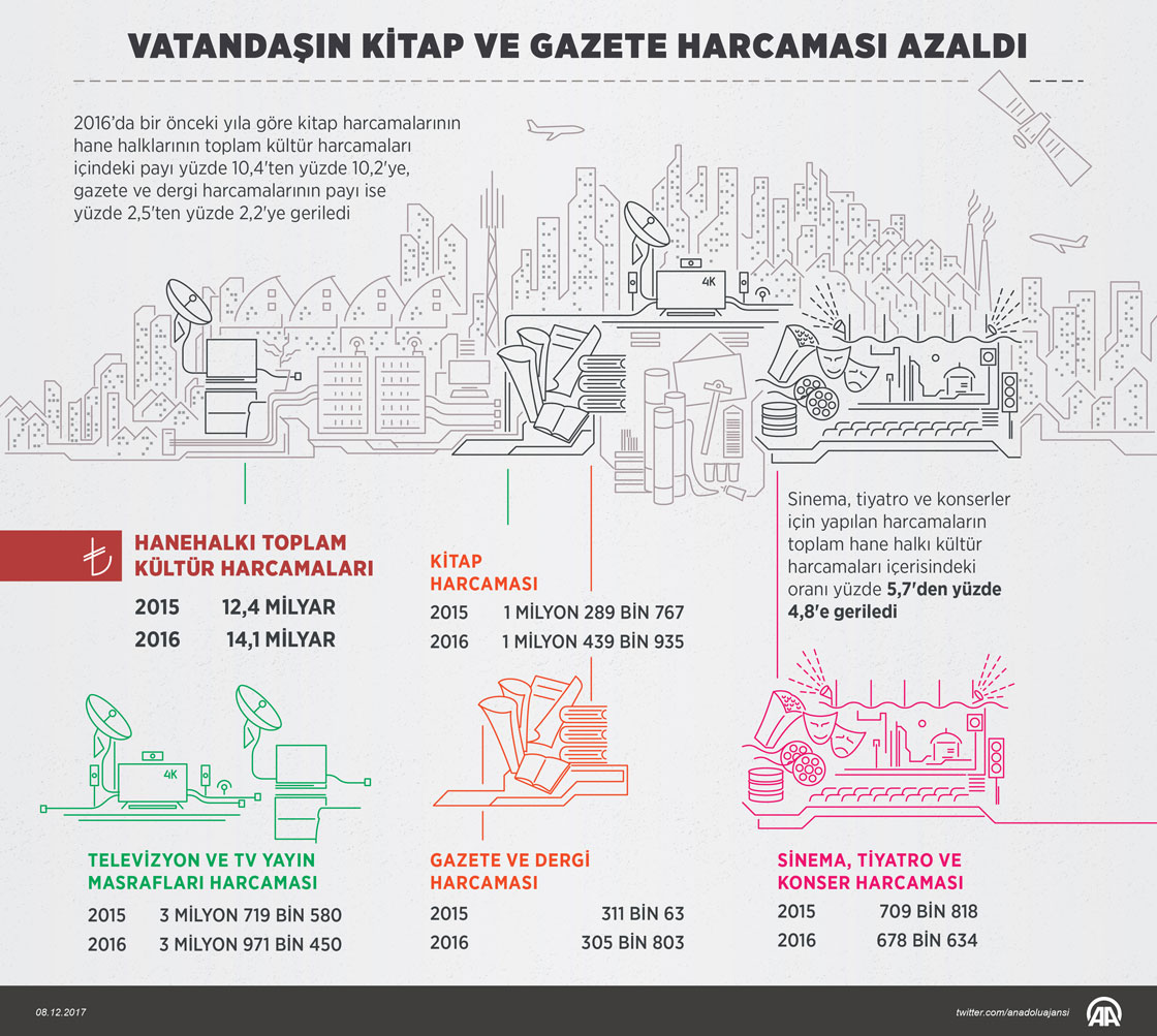 2016 rakamları 2015 ile kıyaslandığında kitap harcamalarının hane halklarının toplam kültür harcamaları içindeki payı yüzde 10,4'ten yüzde 10,2'ye, gazete ve dergi harcamalarının payı ise yüzde 2,5'ten yüzde 2,2'ye geriledi.
