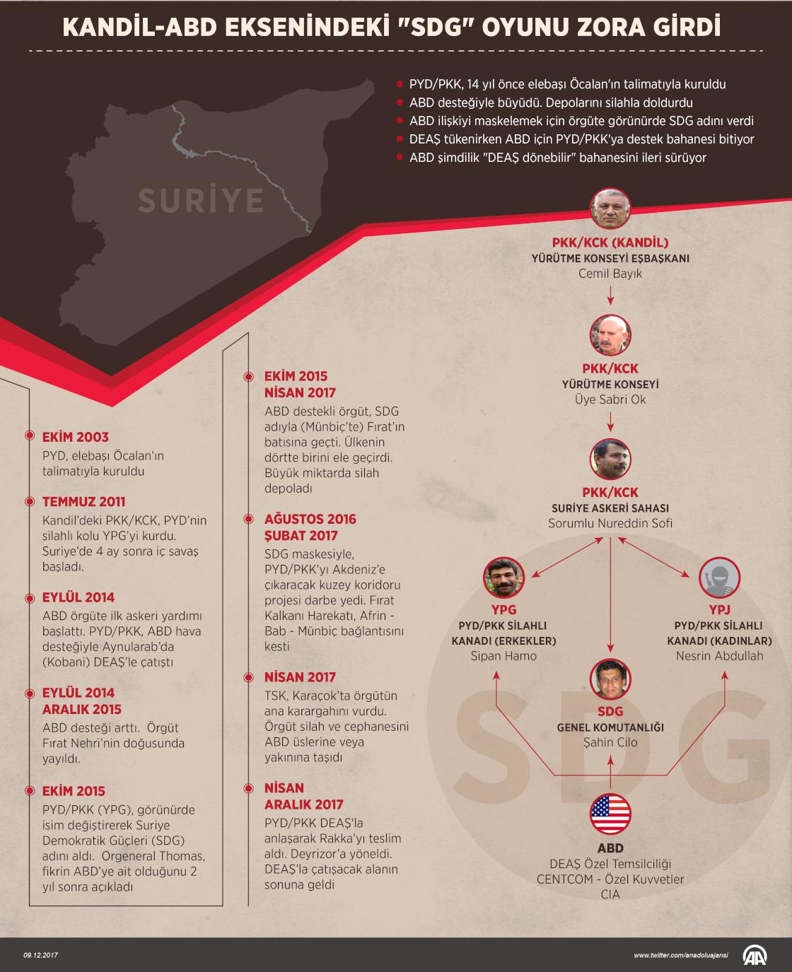 Terör örgütü PYD/PKK'nın kuruluş talimatını 16 Şubat 2002'de, avukatları aracılığıyla PKK/KCK elebaşı Abdullah Öcalan verdi. PKK üst yönetimi, sözde "Kürdistan"ın dört parçasındaki yapılanmaları bir çatı altında toplayan şemsiye yapısına "KCK" ismini veriyor. Buna göre PKK, KCK'nın Türkiye kolu iken, PYD de Suriye kolunu oluşturuyor. Örgütte Irak kolu PÇDK, İran kolu ise PJAK olarak isimlendiriliyor. Suriye'deki terör örgütü PYD/PKK, kuruluşundan 14 yıl sonra ABD'nin desteğiyle ülkenin dörtte birinden fazlasını ele geçirdi. ( Yasin Demirci - Anadolu Ajansı )09 Aralık 2017•Güncelleme: 09 Aralık 2017